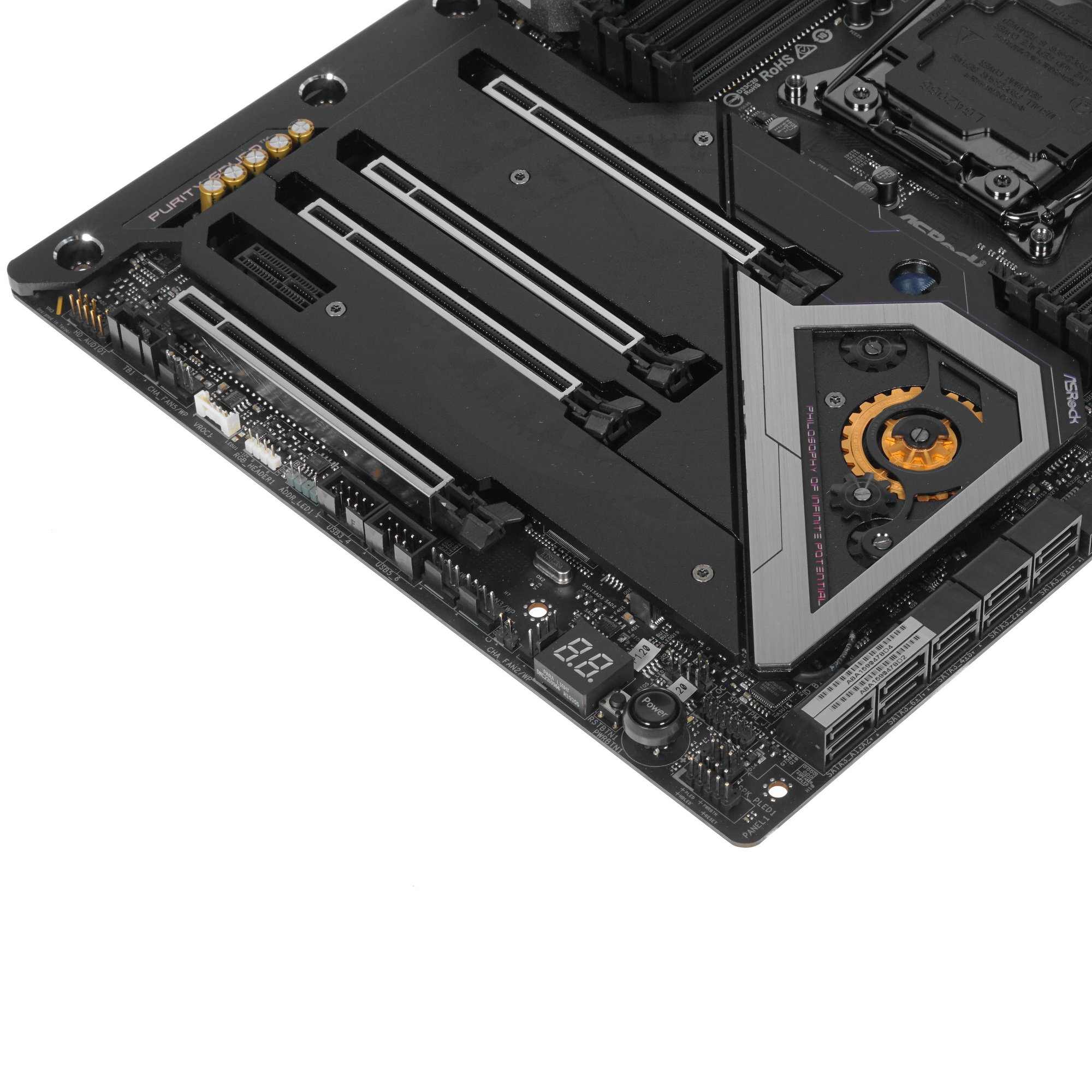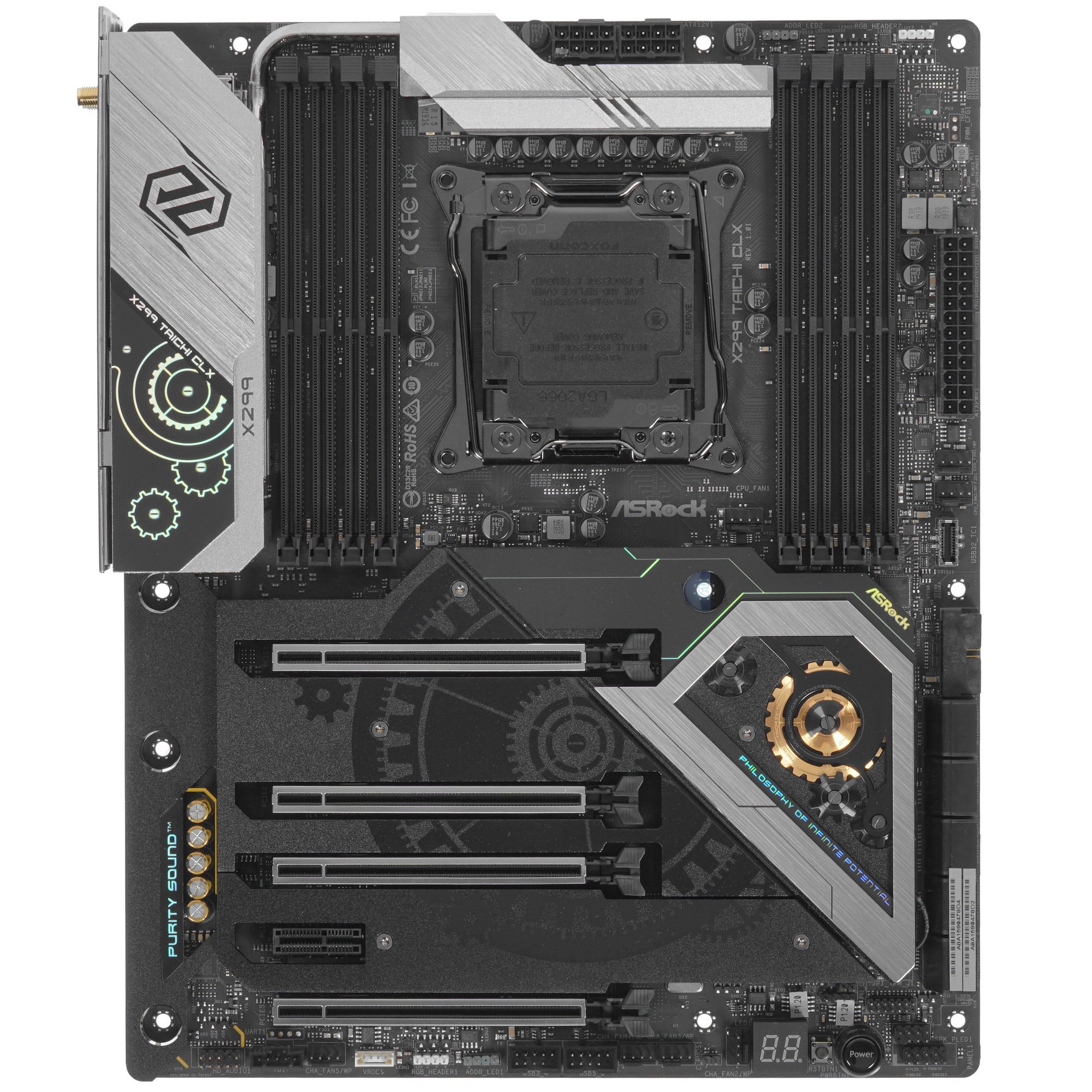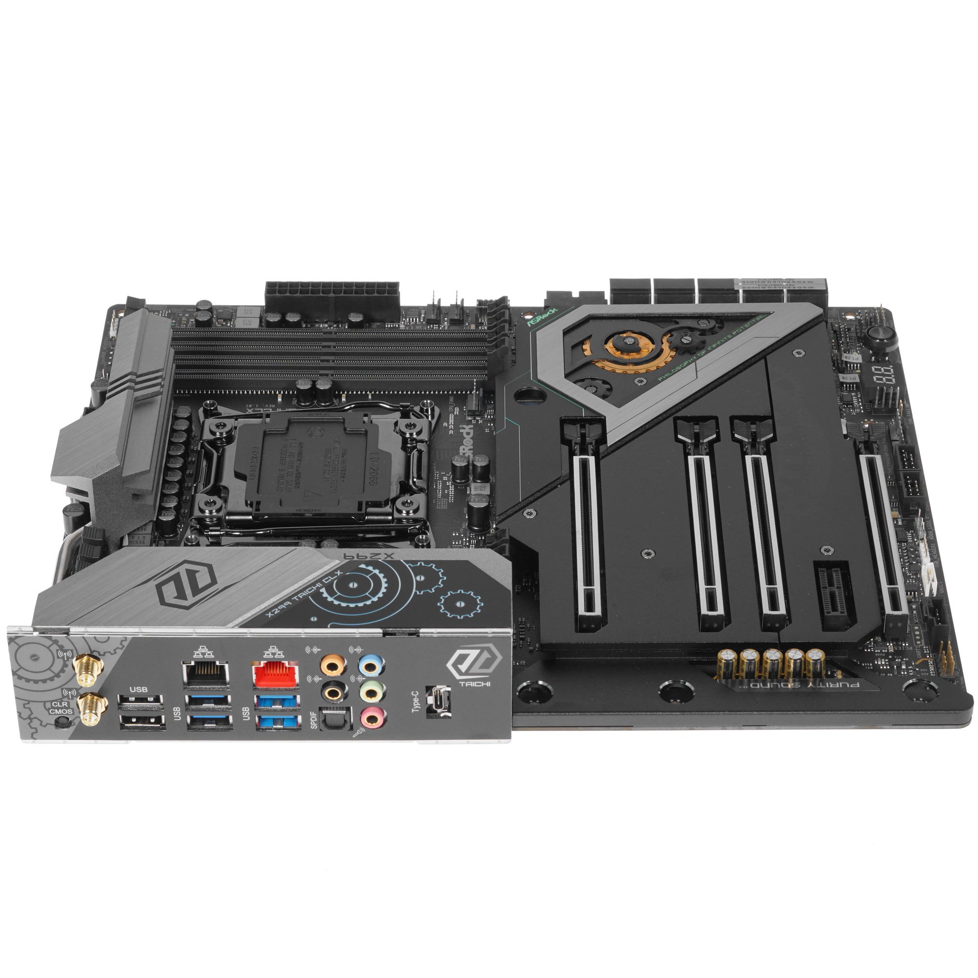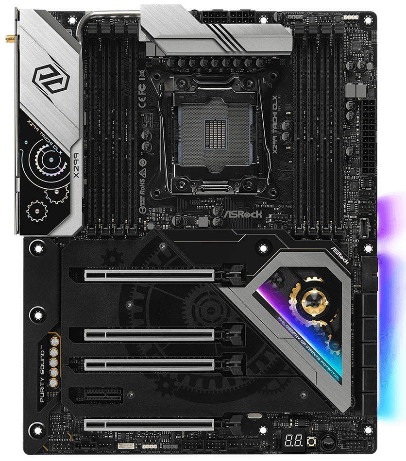 Материнская плата ASRock X299 Taichi CLX одновременно сочетает в себе оригинальный стиль с подсветкой, передовые возможности подключения мощных комплектующих и расширенный набор интерфейсов. Она основана на чипсете Intel X299 и выполнена в стандартном типоразмере ATX. Для подключения комплектующих имеются 8 слотов DIMM DDR4, 4 слота PCI-E x16 версии 3.0, 1 слот PCI-E x1, 10 портов SATA III и 3 разъема M.2.