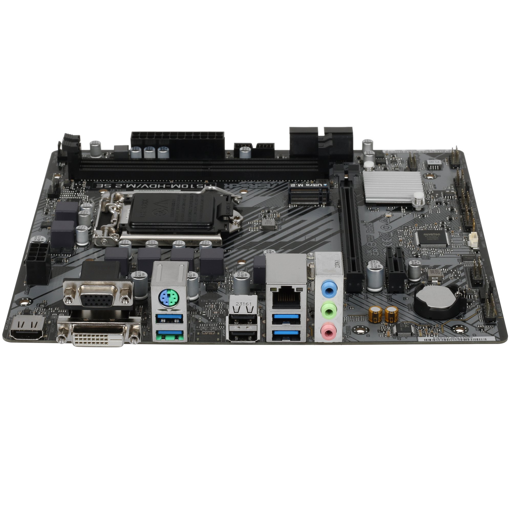 Для подключения видеокарты на ASRock H510M-HDV/M.2 SE предусмотрен разъем PCI-Ex16. Он обеспечивает быстрое считывание данных. Через слот M.2 происходит подключение SSD-дисков. На плате расположены 4 слота SATA для соединения с жесткими дисками.