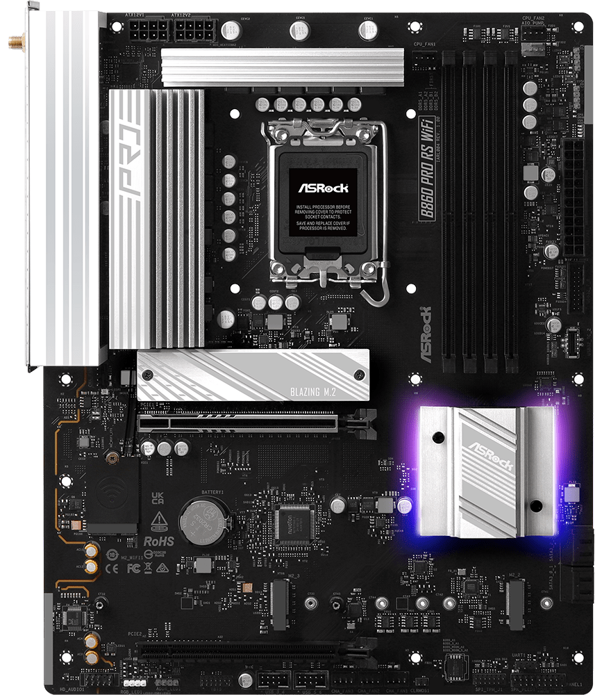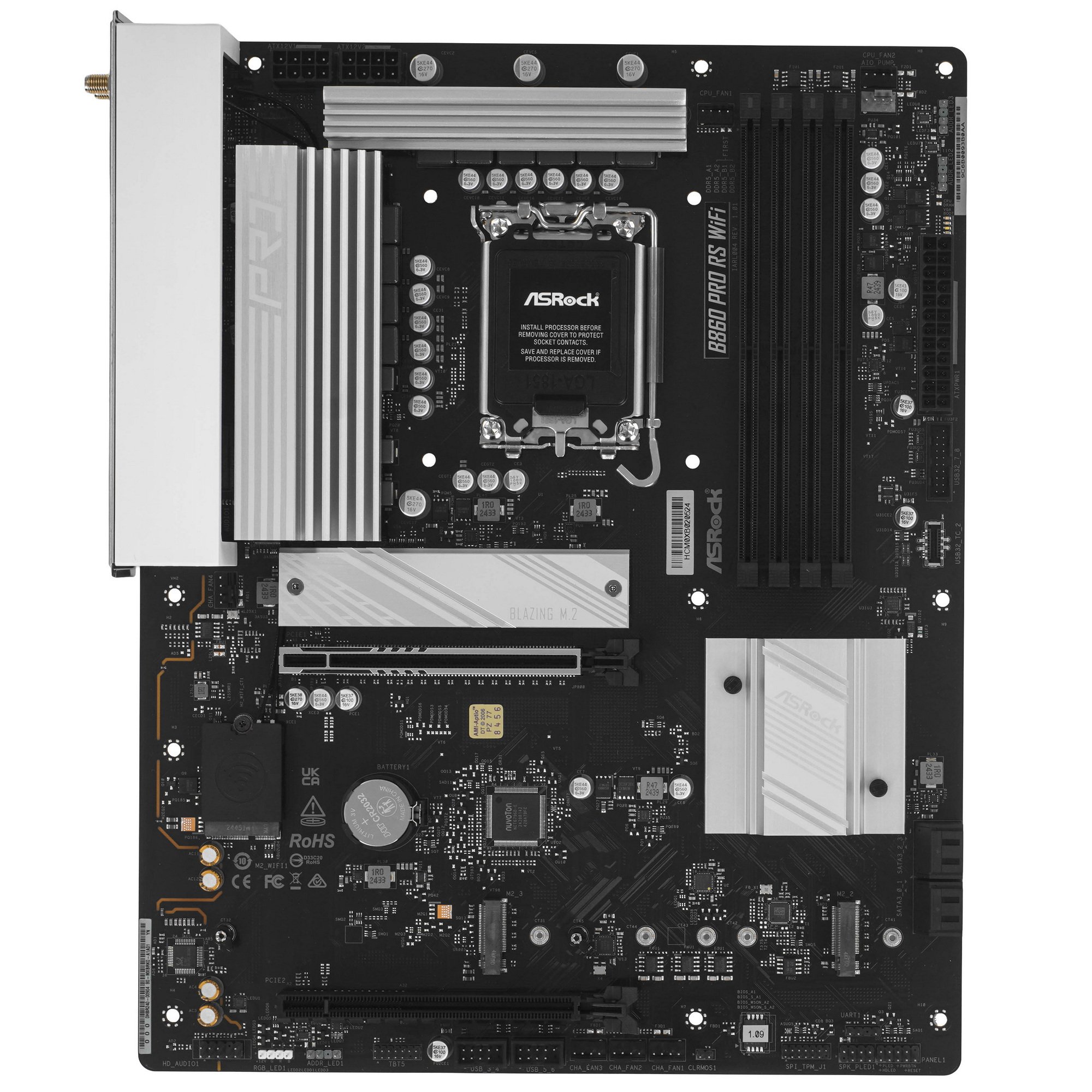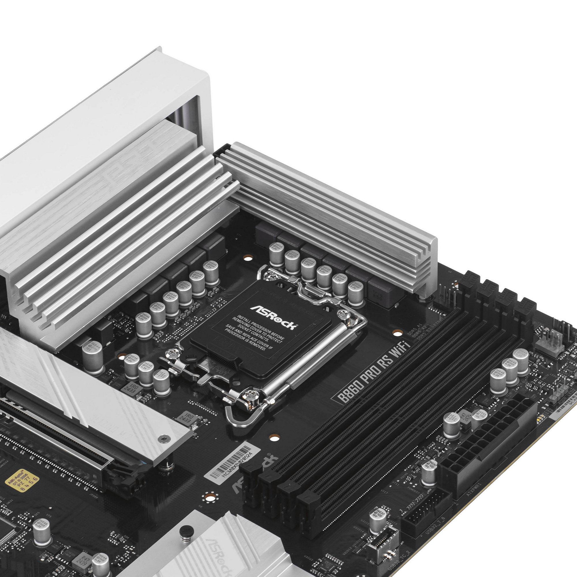Материнская плата ASRock B860 Pro RS WiFi в черном цветовом исполнении оснащается сокетом LGA 1851 для монтажа процессора из линейки Intel. Она послужит стабильной основой для постройки системного блока домашней станции в корпусе типоразмера Standard-ATX.