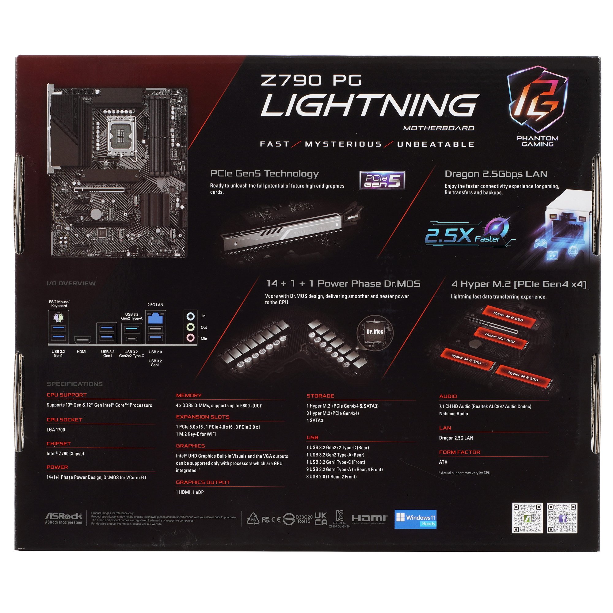Материнская плата ASRock Z790 PG Lightning, LGA 1700, Intel Z790, 4xDDR5, 4xSATA, 4xM.2, 1xPCI-E 5.0 x16, 1xPCI-E 4.0 x16, 3xPCI-E x1, 1xHDMI, 1x 2.5Gb LAN, 5xUSB-A 3.2 Gen 1, 1xUSB-A 3.2 Gen 2, 1xUSB-A 2.0, 1xUSB-C 3.2 Gen 2x2, 3x3.5 мм, 7.1, ATX