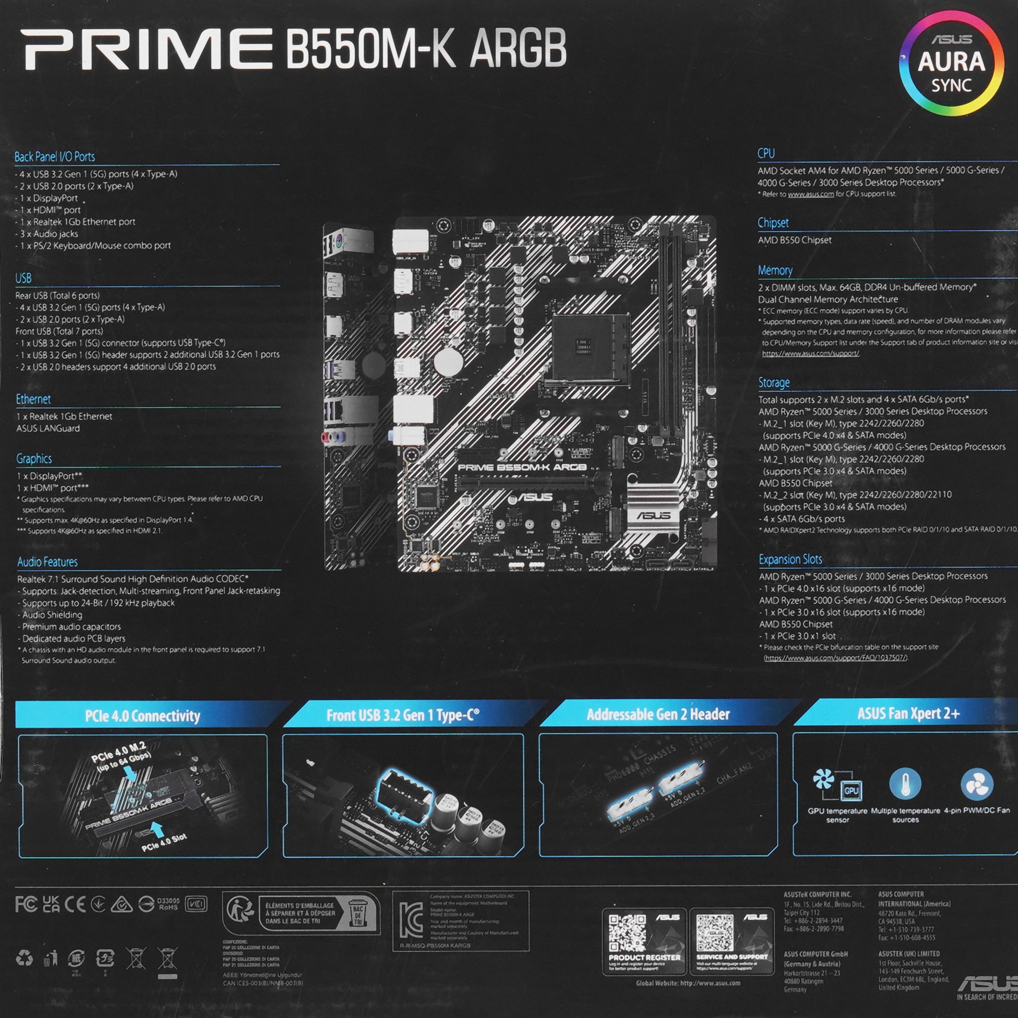 Материнская плата ASUS PRIME B550M-K ARGB разработана для процессоров AMD Ryzen серий 5000, 5000G, 4000G и 3000. Устройство соответствует форм-фактору Micro-ATX и имеет размеры 244x221 мм. Для сборки подойдет компактный корпус. Плата позволяет создать универсальный офисный или домашний компьютер. В модели реализована система комплексного управления охлаждением, которая настраивается с помощью программного обеспечения Fan Xpert 2+ или через UEFI BIOS. Особенностью платы являются встроенные адресуемые разъемы 2-го поколения для светодиодных лент RGB. Они синхронизируется с компьютерными компонентами с поддержкой ASUS Aura Sync.
