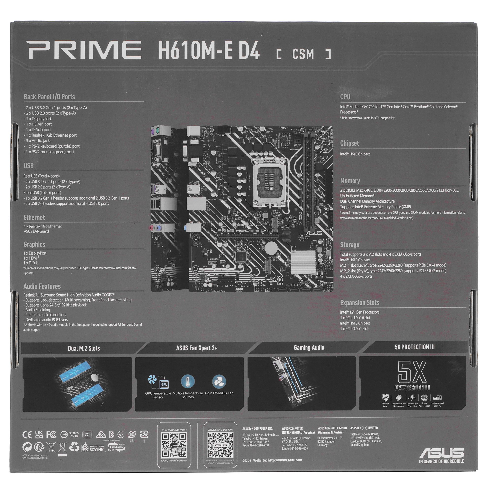 Плата оборудована сетевым контроллером 1 Гбит/с для стабильного соединения с Интернетом. С помощью портов и разъемов на боковой стороне можно организовать подключение различных устройств. Плата оснащена портами USB 2.0 и USB 3.2, видеовыходами DisplayPort, HDMI и VGA, разъемами аудио. Благодаря 8-фазной подсистеме питания и надежным компонентам достигается стабильная работа ASUS PRIME H610M-E D4-CSM.