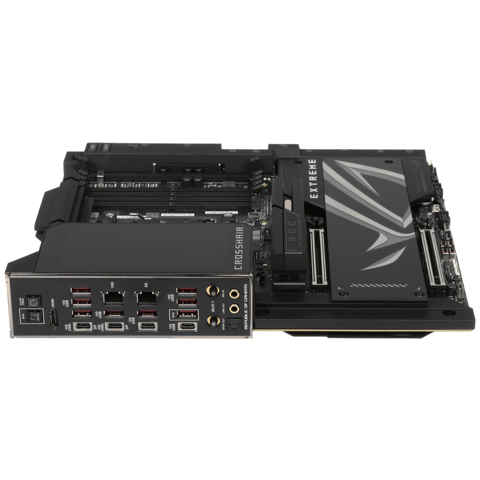 Материнская плата ASUS ROG CROSSHAIR X870E EXTREME – устройство форм-фактора Standard-ATX с размерами 305x277 мм подходит для сборки мощного универсального компьютера для дома или офиса. Плата работает под управлением чипсета AMD X870E и поддерживает процессоры AMD Ryzen 7000, 8000 и 9000. Схема питания 20+2+2 гарантирует реализацию потенциала мощных игровых CPU, а подсистема памяти с поддержкой технологий разгона AMD EXPO обеспечивает стабильность работы модулей DDR5. Максимальный объем ОЗУ равен 256 ГБ.