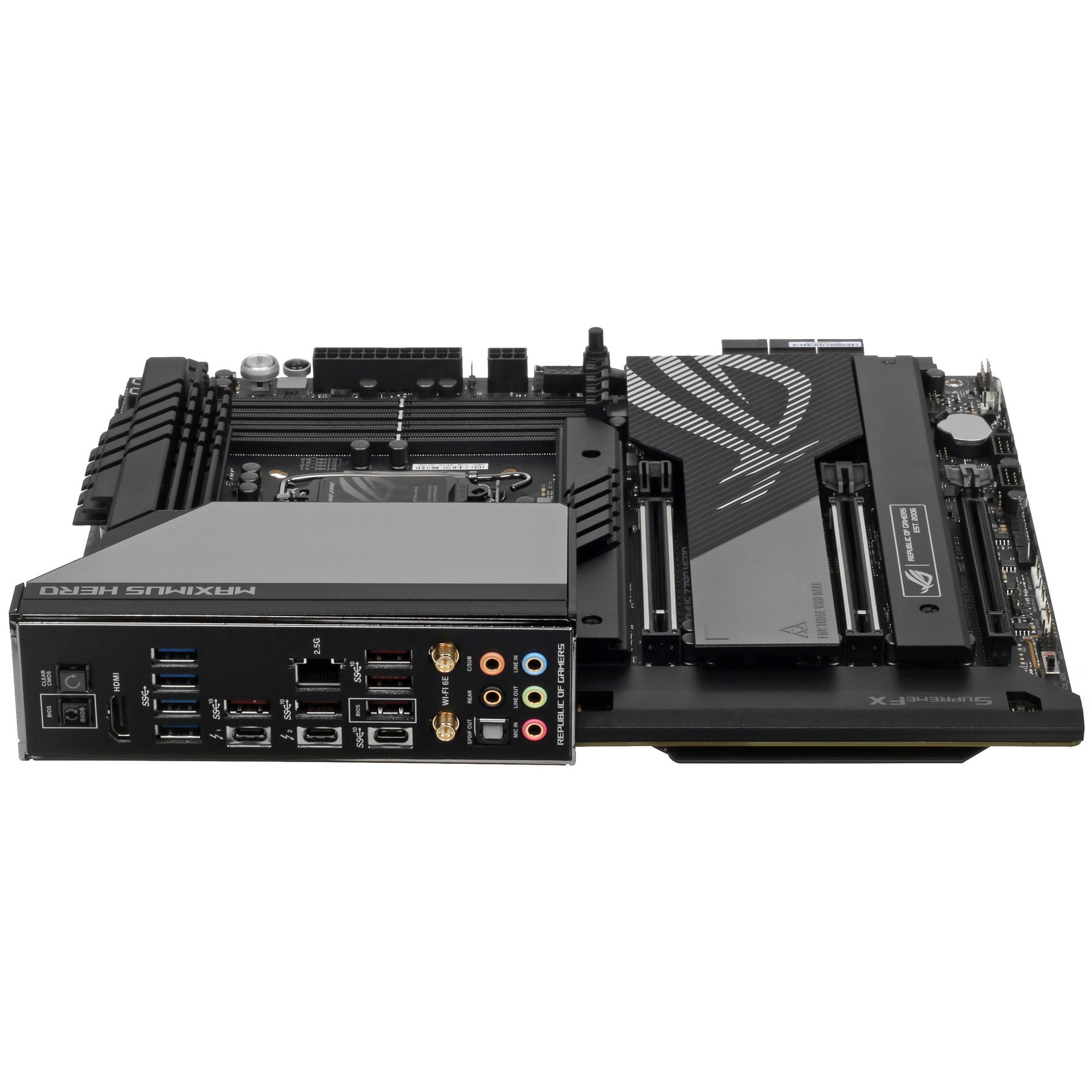 В ASUS ROG MAXIMUS Z790 HERO реализованы проводной контроллер со скоростью 2.5 Гбит/с и контроллер беспроводной связи Wi-Fi для стабильного соединения с Интернетом. Усиленная подсистема питания 20+1+2 фаз, твердотельные конденсаторы и другие надежные составляющие гарантируют стабильность работы материнской платы. Подсветка RGB поддерживает синхронизацию с устройствами и предлагает широкие возможности программирования по предпочтениям пользователя.