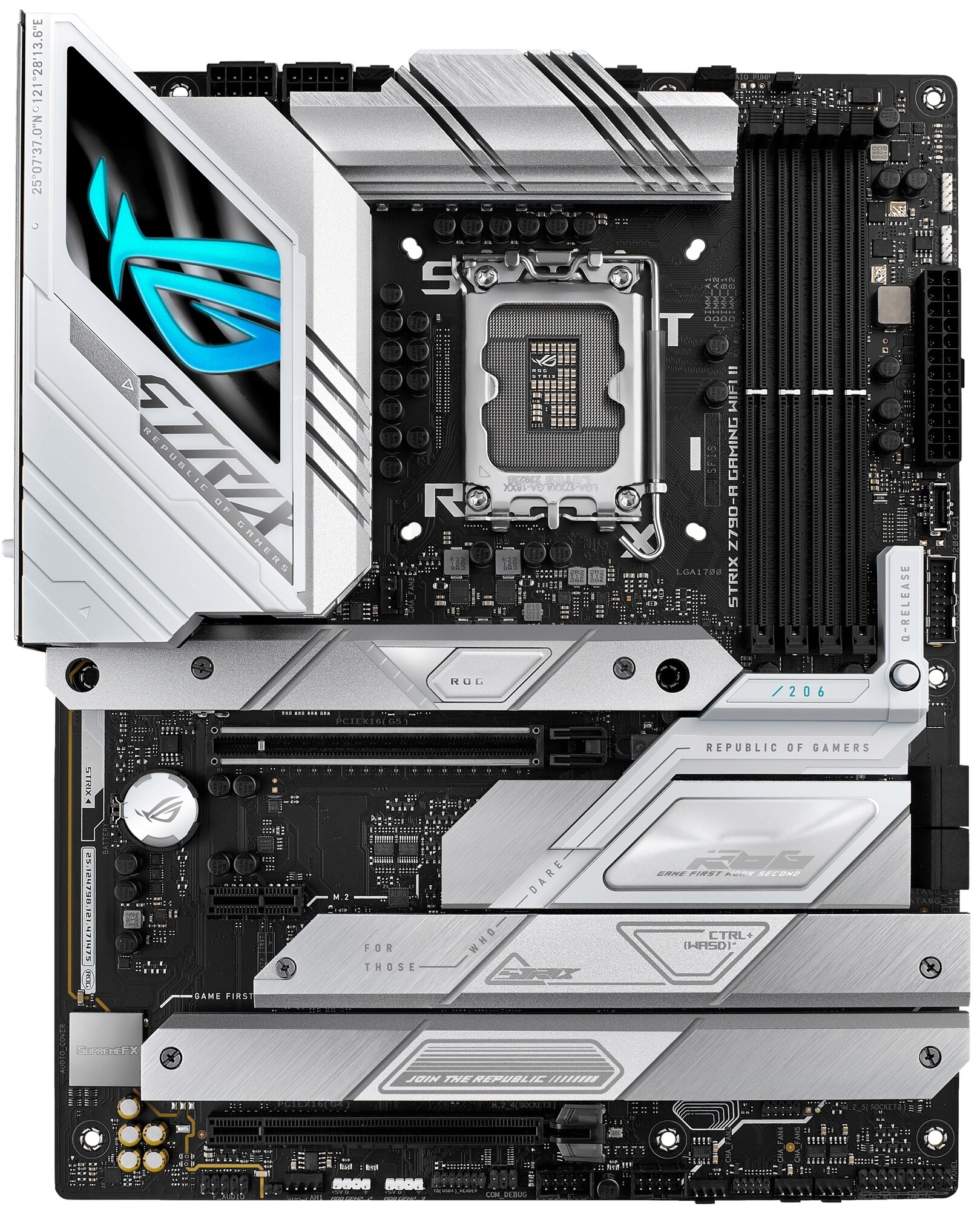 Плата ASUS ROG STRIX Z790-A GAMING WIFI II соответствует форм-фактору Standard-ATX и имеет размеры 305x244 мм. Массивные серебристые радиаторы покрывают зону VRM, чипсет и 5 разъемов M.2. При любых нагрузках ключевые компоненты ПК защищены от перегрева.
