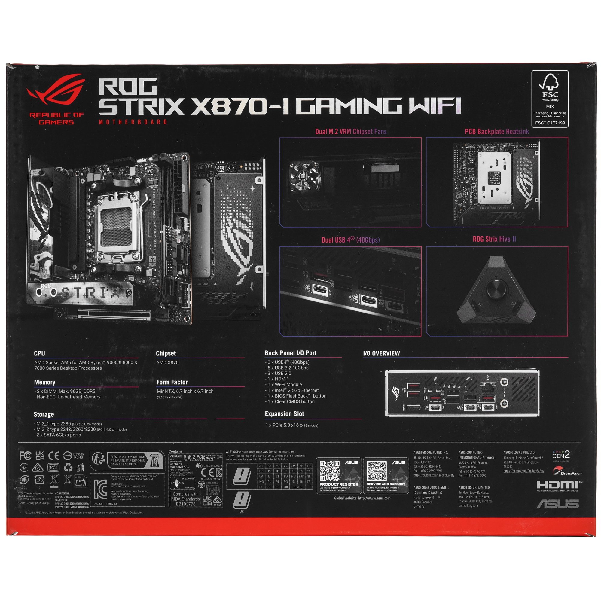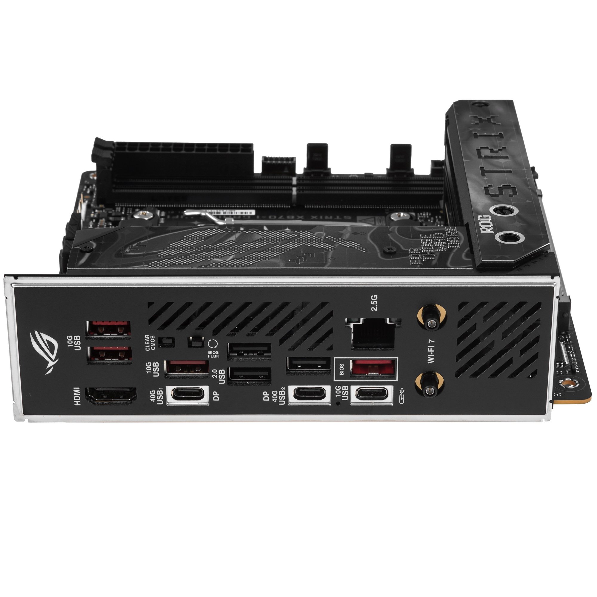 Материнская плата ASUS ROG STRIX X870-I GAMING WIFI, AM5, AMD X870, 2xDDR5, 2xSATA, 2xM.2, 1xPCI-E 5.0 x16, 1xHDMI, 2xUSB-C USB4, 1xUSB-C 10Gbps, 4xUSB-A 10Gbps, 1x 2.5Gb LAN, 2x3.5 мм, Mini-ITX