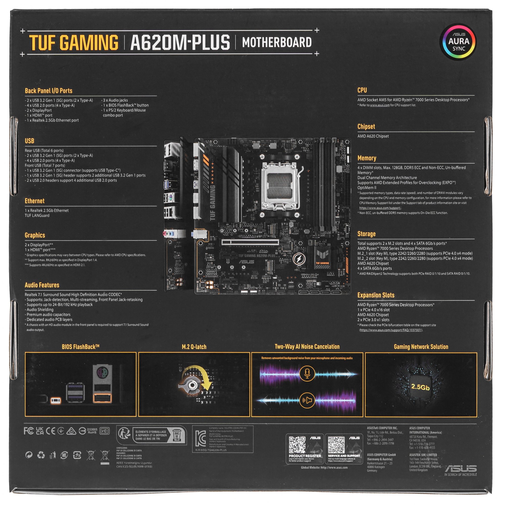 Материнская плата ASUS TUF GAMING A620M-PLUS, AM5, AMD A620, 4xDDR5, 4xSATA, 2xM.2, 1xPCI-E 4.0 x16, 2xPCI-E x1, 2xDP, 1xHDMI, 1x 2.5Gb LAN, 2xUSB-A 3.2 Gen 1, 4xUSB-A 2.0, 3x3.5 мм, 7.1, Micro-ATX