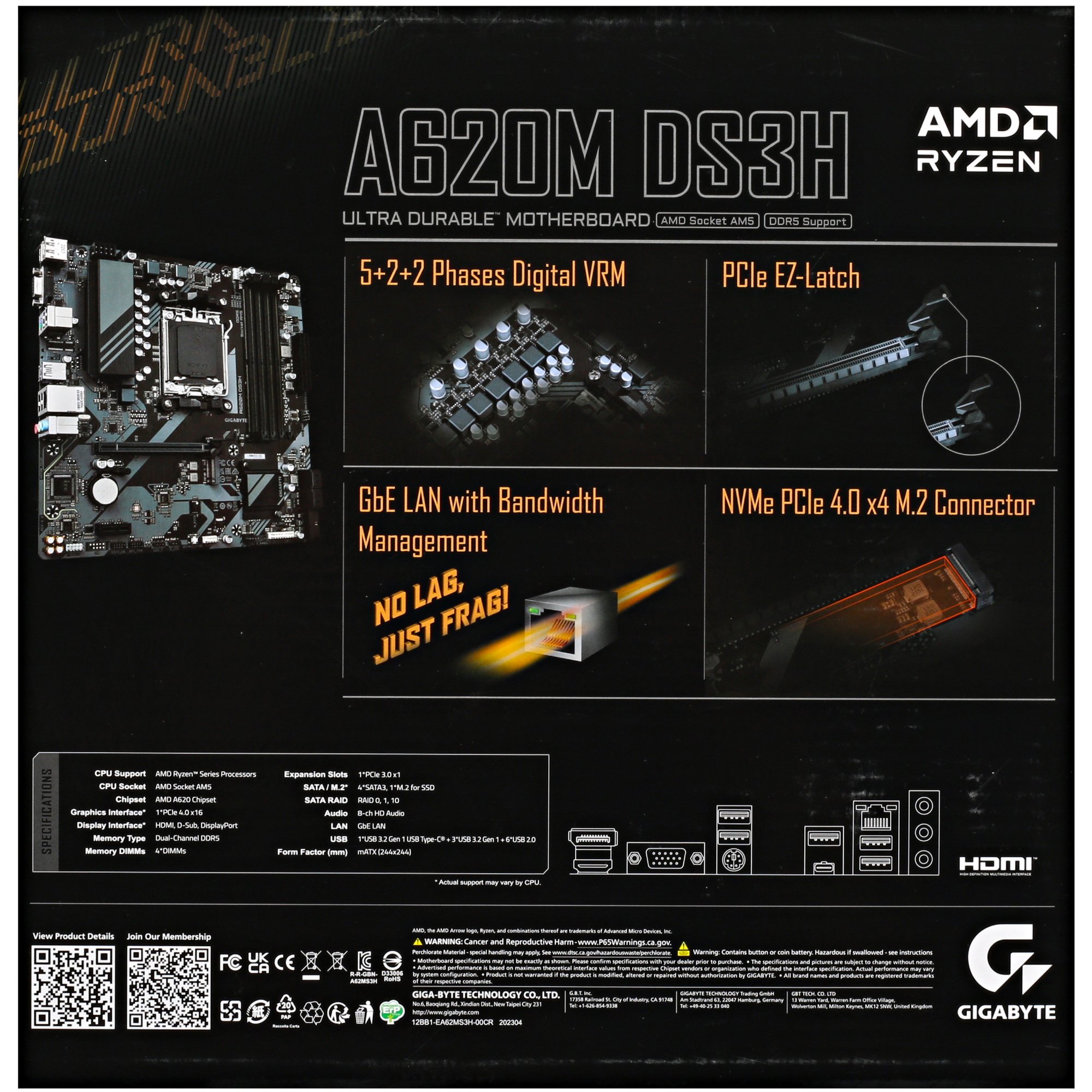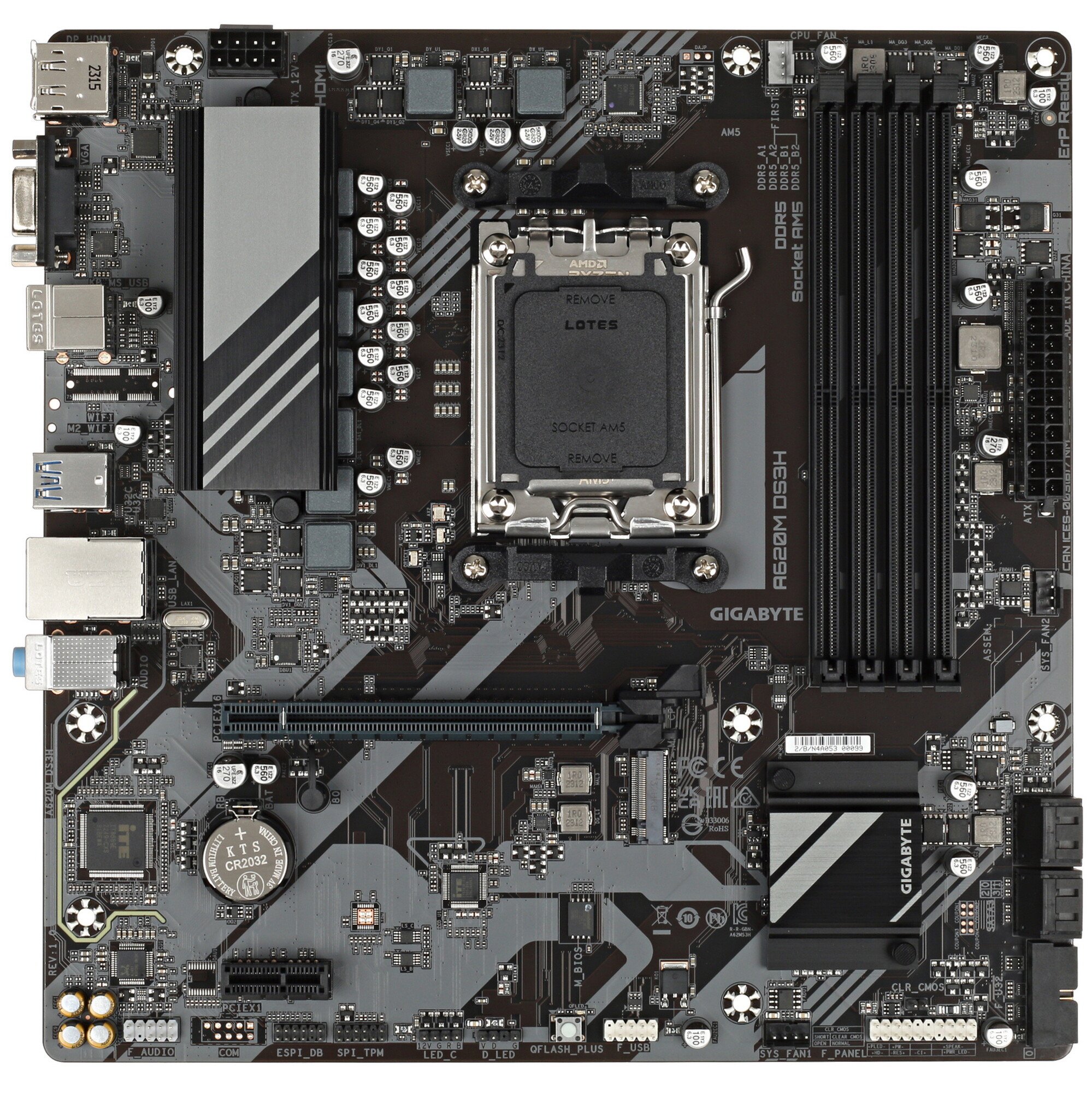 Материнская плата GIGABYTE A620M DS3H представлена в форм-факторе Micro-ATX с размерами 244x244 мм, поэтому подходит для установки в компактный системный блок. Она поддерживает установку процессора AMD Raphael с сокетом AM5. Для подключения оперативной памяти объемом до 256 ГБ есть 4 слота DIMM DDR5. Дискретная видеокарта устанавливается с помощью слотов PCI-E x16 и PCI-E x1. Накопители HDD/SSD можно задействовать посредством 1 разъема M.2 и 4 слотов SATA.