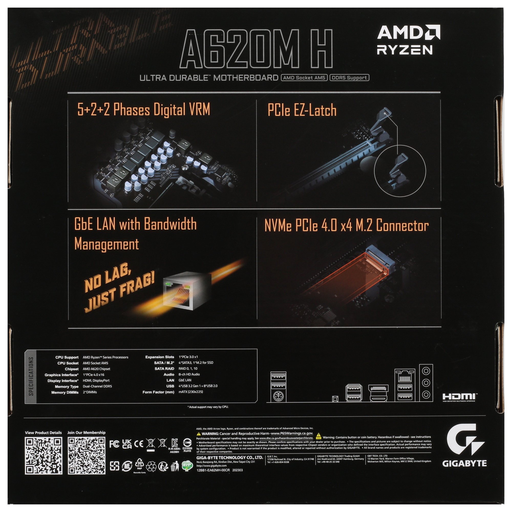 В GIGABYTE A620M H соединение с Интернетом выполняется проводным способом через сетевой контроллер со скоростью 1 Гбит/с. Усиленная подсистема питания 5+2+2 фазы и твердотельные конденсаторы гарантируют стабильность работы материнской платы. Утилита APP Center предлагает пользователям настройку параметров производительности.