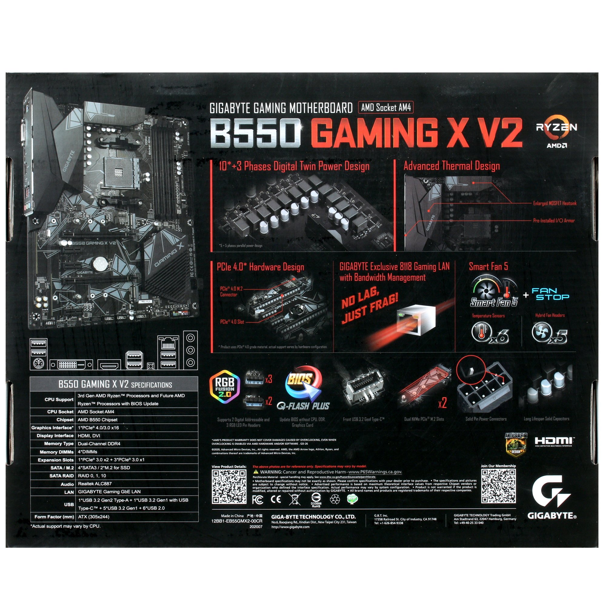 Материнская плата GIGABYTE B550 GAMING X V2 оснащена звуковым адаптером 7.1 и гигабитным сетевым адаптером Realtek RTL8118AS. Подсветка отсутствует. В комплекте – пара шлейфов SATA, диск с программным обеспечением и документация.