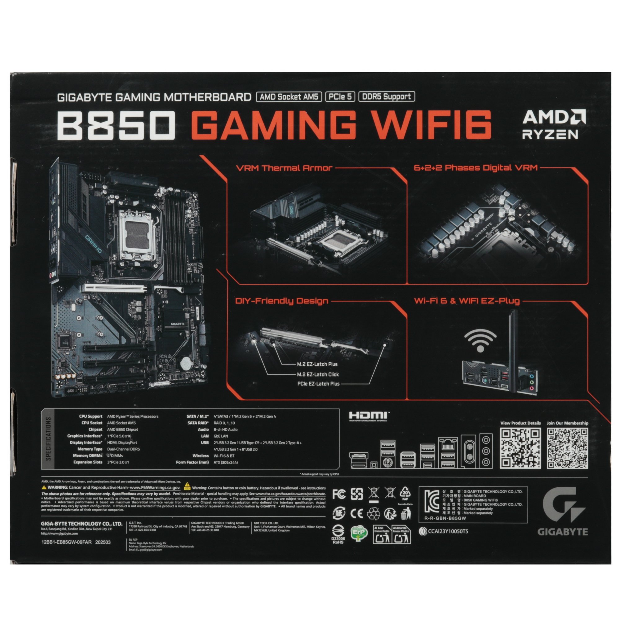Материнская плата GIGABYTE B850 GAMING WF6 предназначена для игрового ПК. Есть множество слотов расширения и разъемов для подключения жестких дисков, SSD-накопителей, видеокарт и других устройств. Модель дополнена встроенными модулями Wi-Fi и Bluetooth для беспроводного подключения компьютера к сети и периферии. В материнской плате есть кнопки очистки CMOS для сброса настроек BIOS при появлении неполадок в работе компьютера или проблем с совместимостью, Q-Flash Plus для обновления и восстановления BIOS с помощью USB-накопителя без установки процессора и оперативной памяти.