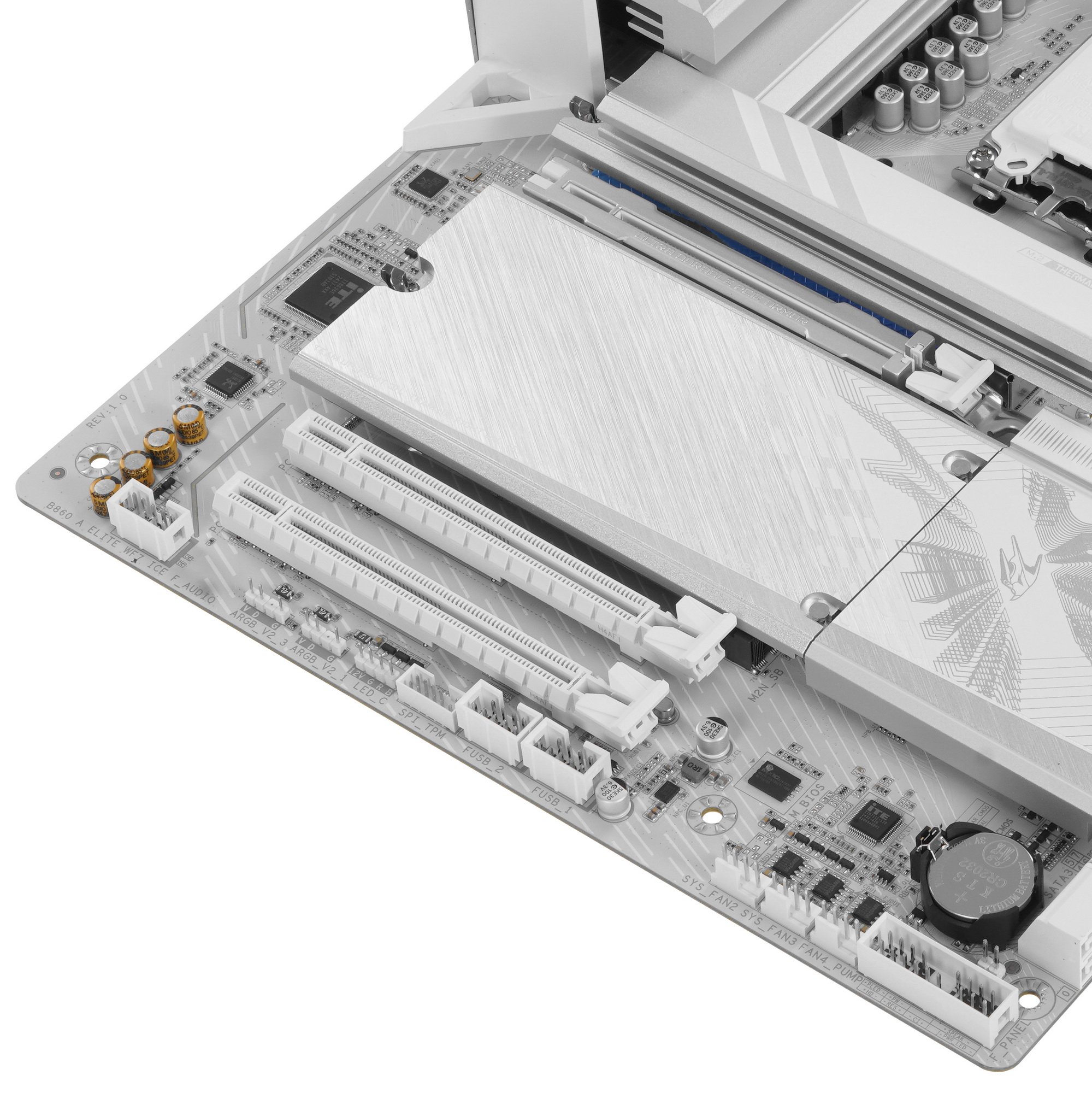 За отвод тепла от чипсета, процессора и других комплектующих отвечают массивные охлаждающие радиаторы. Они украшены декоративными элементами в стиле линейки AORUS. Светодиодная подсветка RGB предусматривает программирование цветовой палитры и эффектов. Проводное подключение к Интернету выполняется посредством интерфейса LAN со скоростью 2.5 Гбит/с. Для беспроводной коммуникации в плату GIGABYTE B860 AORUS ELITE WIFI7 ICE интегрирован контроллер с поддержкой Wi-Fi 7 и технологии Bluetooth 5.4.