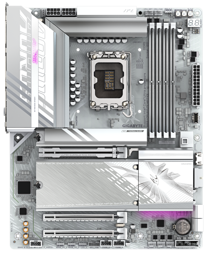 Материнская плата Gigabyte B860 AORUS ELITE WIFI7 ICE, LGA 1851, Intel B860, 4xDDR5, 4xSATA, 3xM.2, 1xPCIe 5.0 x16, 2xPCIe 4.0 x1, 1xHDMI, 2xDP, 1x 2.5Gb LAN, 6xUSB-A 3.2, 1xUSB-C 3.2, 4xUSB-A 2.0, 2x3.5 мм, 7.1, ATX