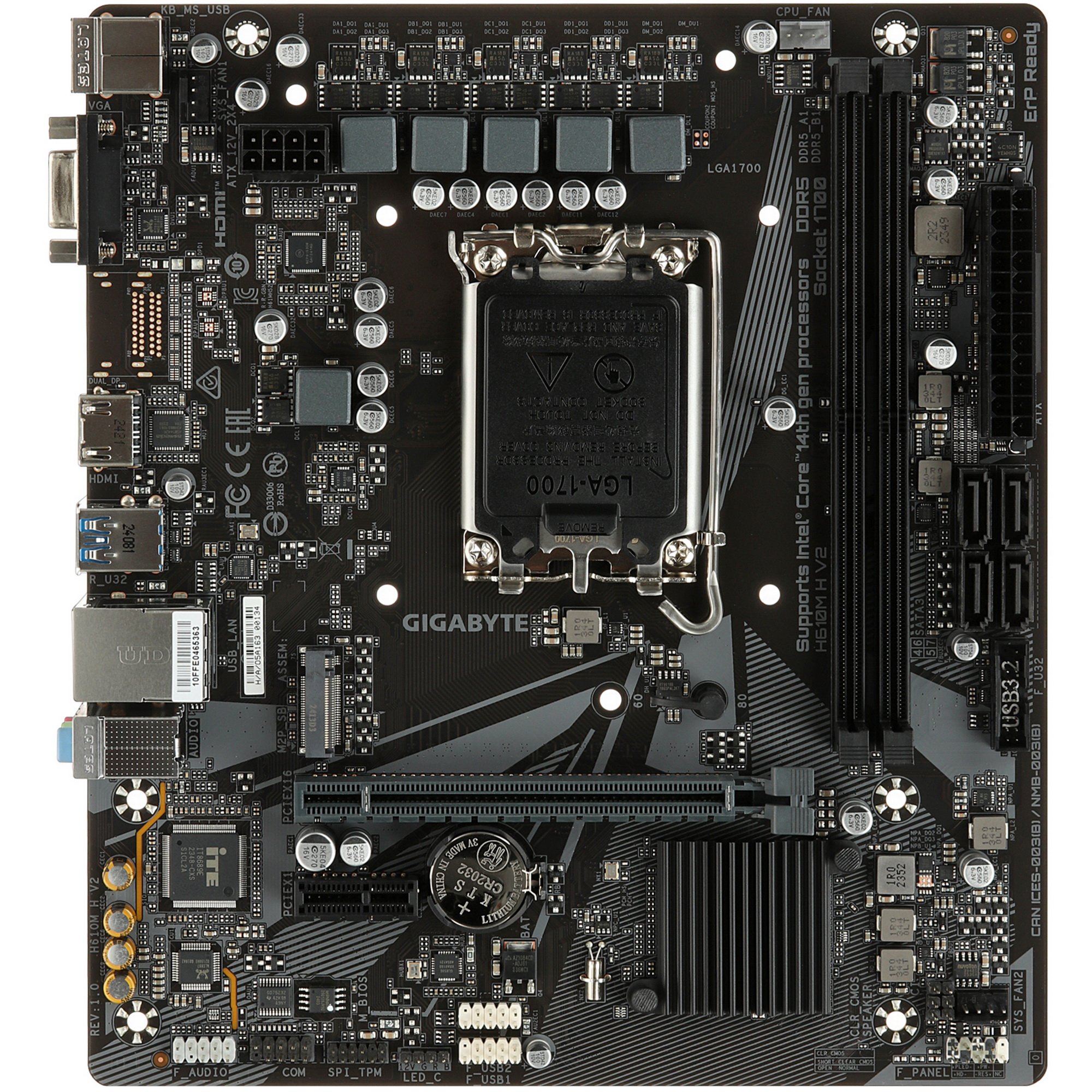 Материнская плата GIGABYTE H610M H V2 выполняется в типоразмере Micro-ATX и предоставляет базу для постройки малогабаритного настольного системного блока для домашней станции или офисного ПК. Модель с чипсетом Intel H610 в основе совместима с процессорным сокетом LGA1700. На нее можно установить центральный процессор серий Intel Celeron G, Intel Core 12-14 Gen и ряда других. К плате вы сможете присоединить до 2 планок ОЗУ стандарта DDR5 форм-фактора DIMM с частотой работы до 5600 МГц.