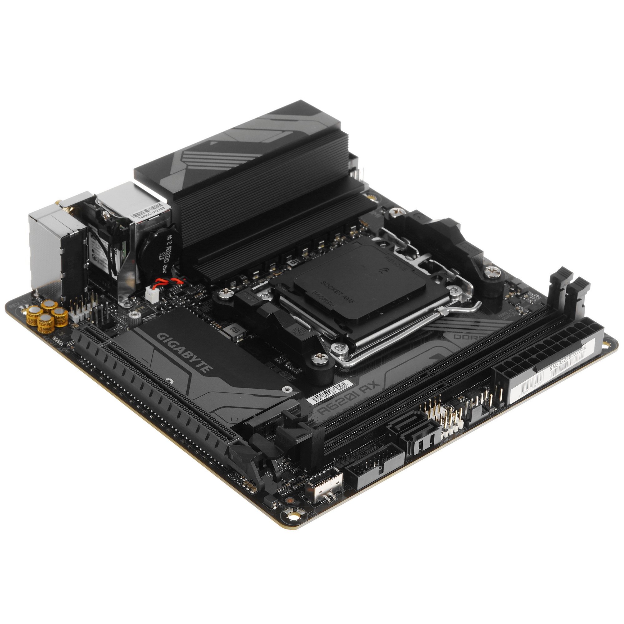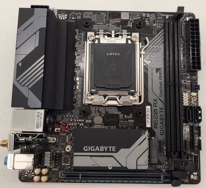 Материнская плата GIGABYTE A620I AX с размерами 170x170 мм соответствует форм-фактору Mini-ITX. Сокет AM5 обеспечивает совместимость с процессорами AMD Ryzen серии 7000. Плата оснащена 2 разъемами под установку до 128 ГБ оперативной памяти стандарта DDR5, 1 слотом расширения PCI-E x16 для графического адаптера, 1 разъемом M.2 и 2 портами SATA для запоминающих устройств SSD/HDD.
