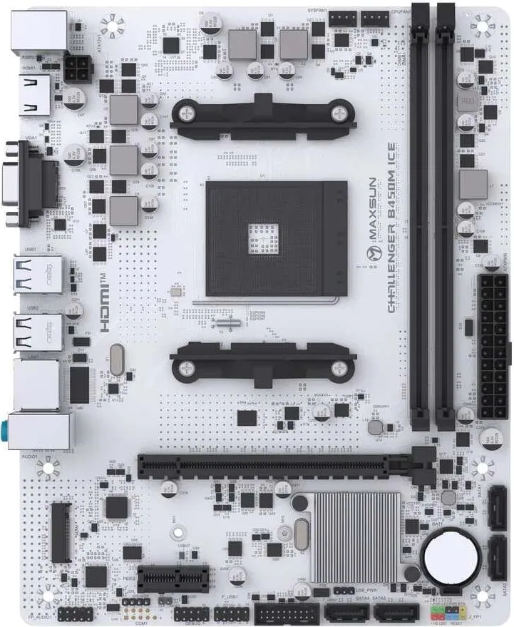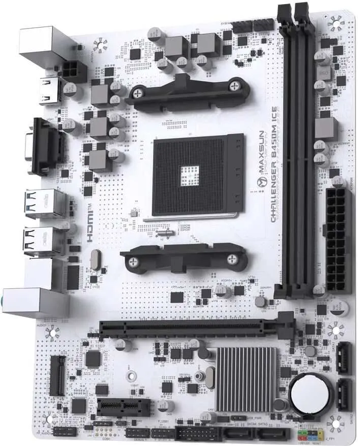 Материнская плата MaxSun Challenger B450M ICE ориентирована на интеграцию в офисный и домашний ПК для решения повседневных задач: работы с документами, веб-серфинга, просмотра мультимедийного контента, запуска игр с нетребовательными настройками. Она оборудована чипсетом AMD B450 с поддержкой процессора AM4. Плата позволяет задействовать до 64 ГБ оперативной памяти с помощью 2 слотов DIMM. Для размещения накопителей есть 4 разъема SATA и 1 M.2. Слот PCI-E x16 предусматривает установку видеокарты.