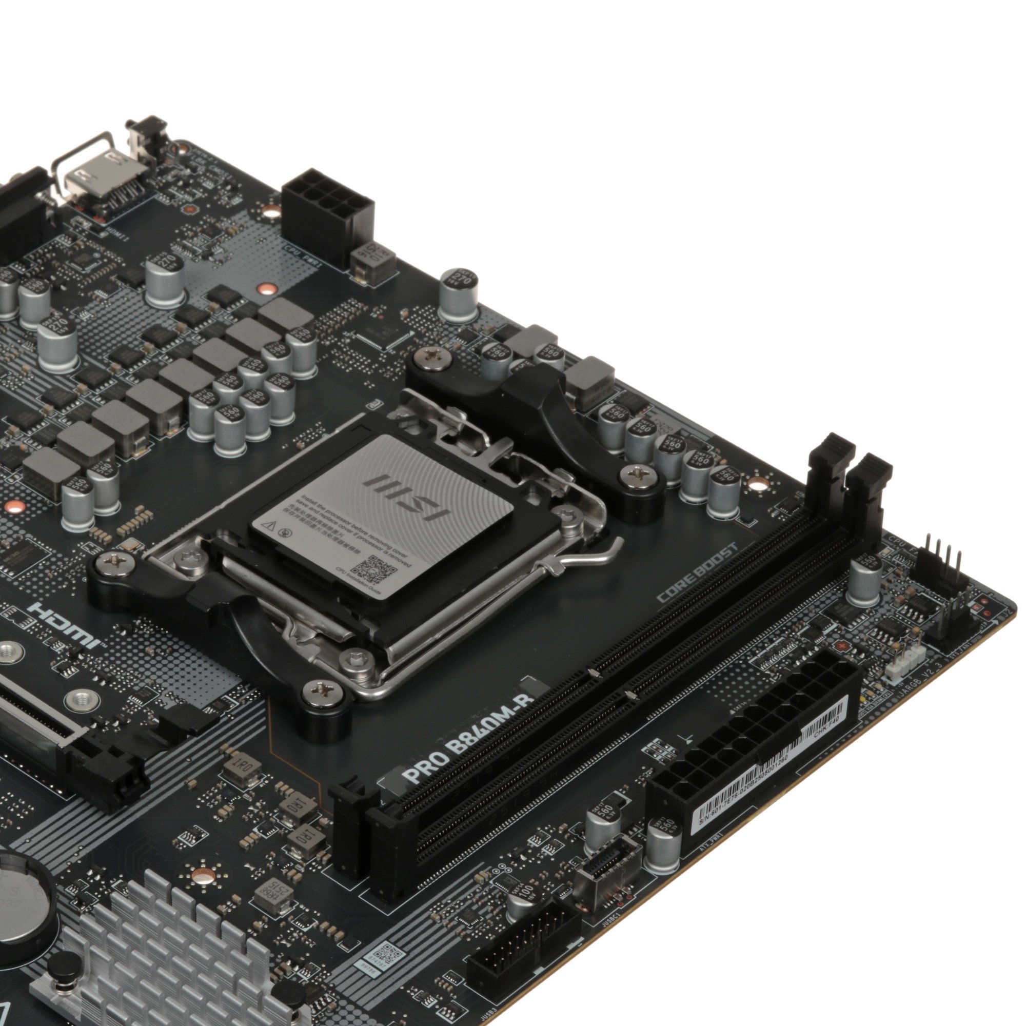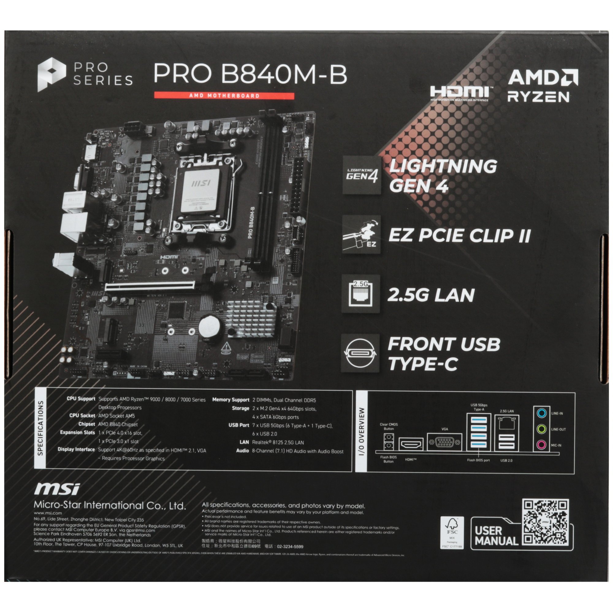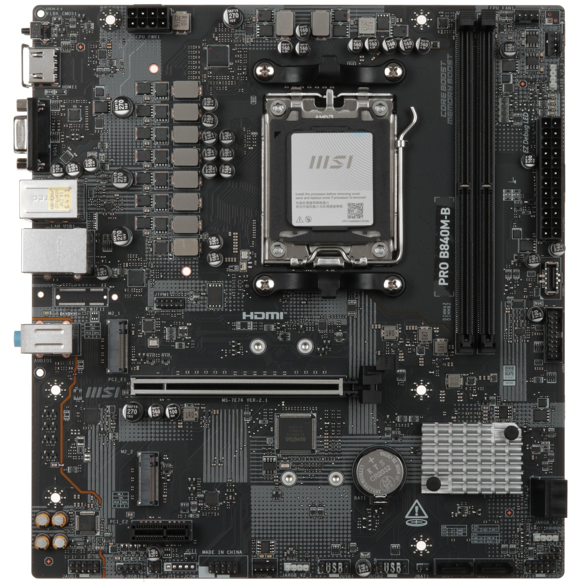 Материнская плата MSI PRO B840M-B. Устройство форм-фактора Micro ATX с размерами 244x226 мм подходит для сборки мощного универсального компьютера для дома или офиса. Плата работает под управлением чипсета AMD B840 и поддерживает процессоры AMD Ryzen 7000, 8000 и 9000. Схема питания 7+2+1 гарантирует реализацию потенциала мощных игровых CPU, а подсистема памяти с поддержкой технологий разгона AMD EXPO обеспечивает стабильность работы производительных модулей DDR5. Максимальный объем ОЗУ равен 128 ГБ.
