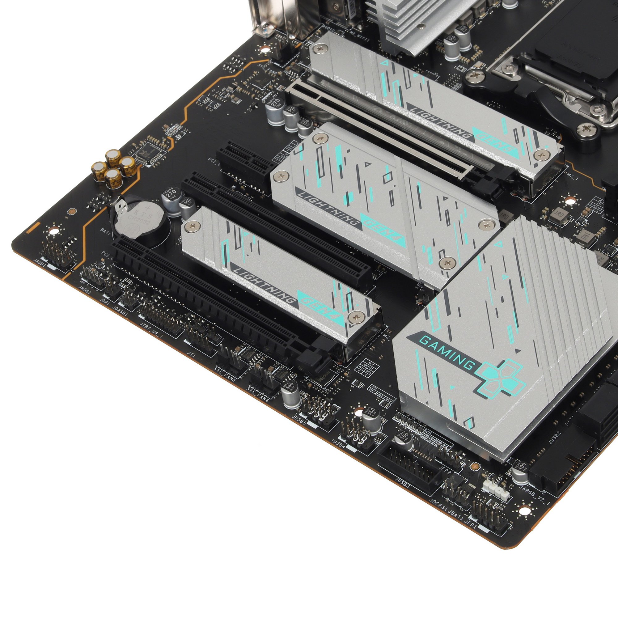 Преимуществом платы является наличие модулей Wi-Fi 6E (802.11ax) и Bluetooth 5.3. Беспроводные соединения устанавливаются без применения дополнительного оборудования. Устройство защищено от перегрева радиаторами зоны VRM, чипсета и разъемов M.2. В оснащение платы входят 2.5-гигабитный порт Ethernet и звуковой адаптер с поддержкой объемного звука 7.1.