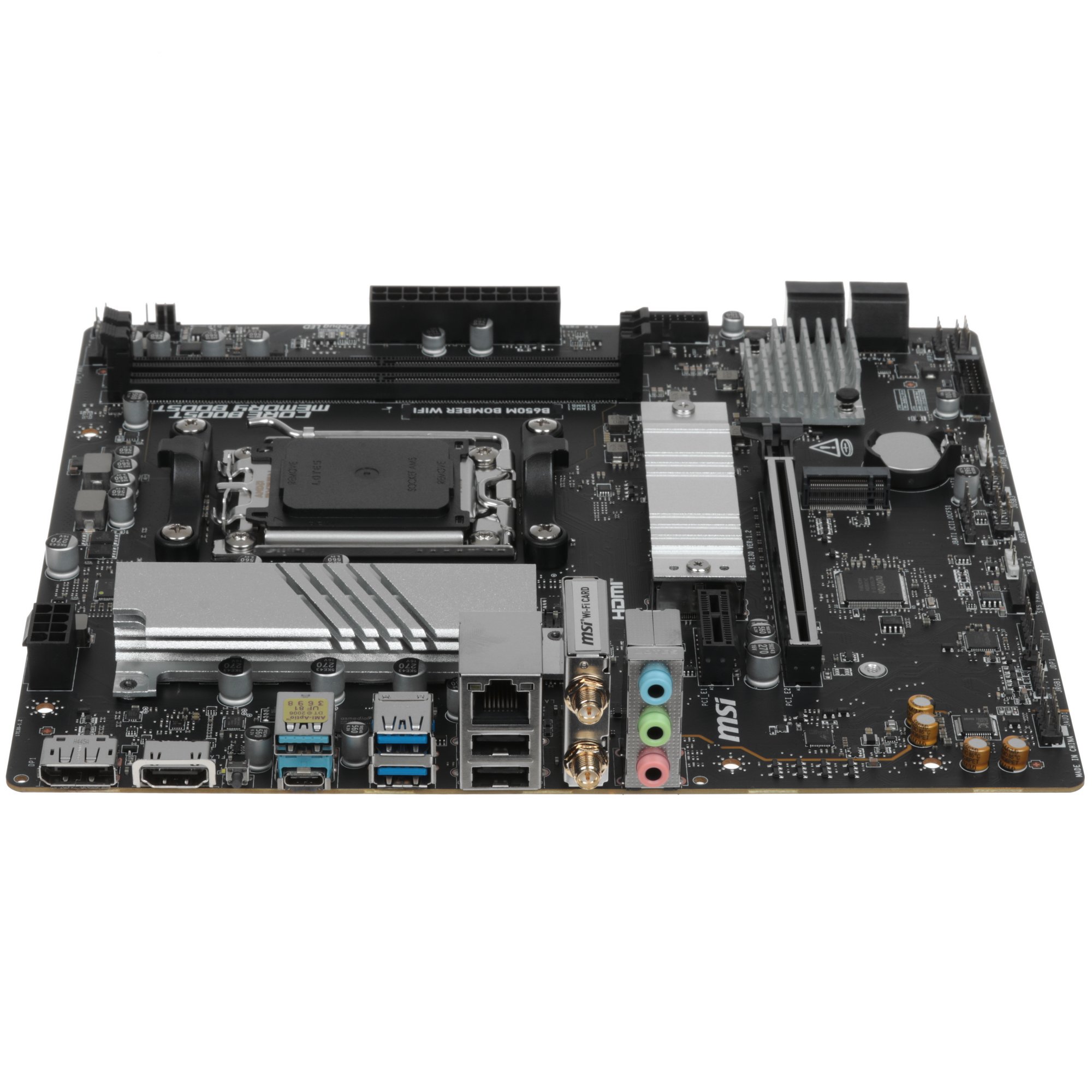 Материнская плата MSI B650M BOMBER WIFI ориентирована на сборку домашнего или офисного системного блока для работы с мультимедиа и решения других задач. Модель на базе чипсета AMD B650 поддерживает процессоры AMD сокета AM5 с ядрами Granite Ridge, Phoenix и Raphael. Форм-фактор платы – Micro-ATX. Устройство с размерами 244x226 мм сочетает широкий функционал с возможностью установки в компактный корпус. Цифровая система питания реализует потенциал многоядерных CPU в играх и ресурсоемких приложениях.
