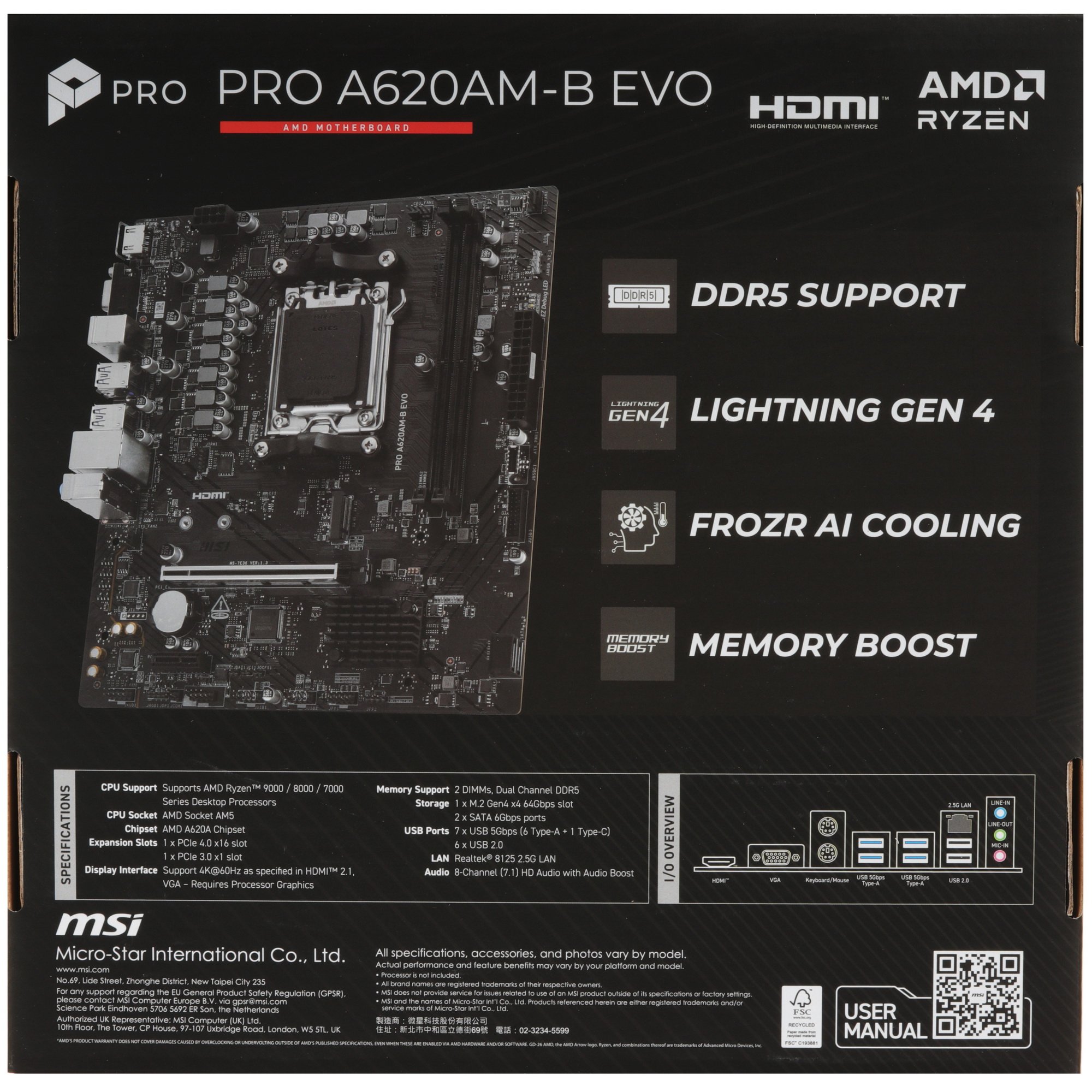 Материнская плата MSI PRO A620AM-B EVO A620, AM5, 2*DDR5, 1*PCIEx16, 1*PCIEx1, 1*M.2, 1*TypeC, 6*USB3.2Gen1, 6*USB2.0, 2*SATA3.0, 2.5G, VGA, HDMI, M-ATX, RTL
