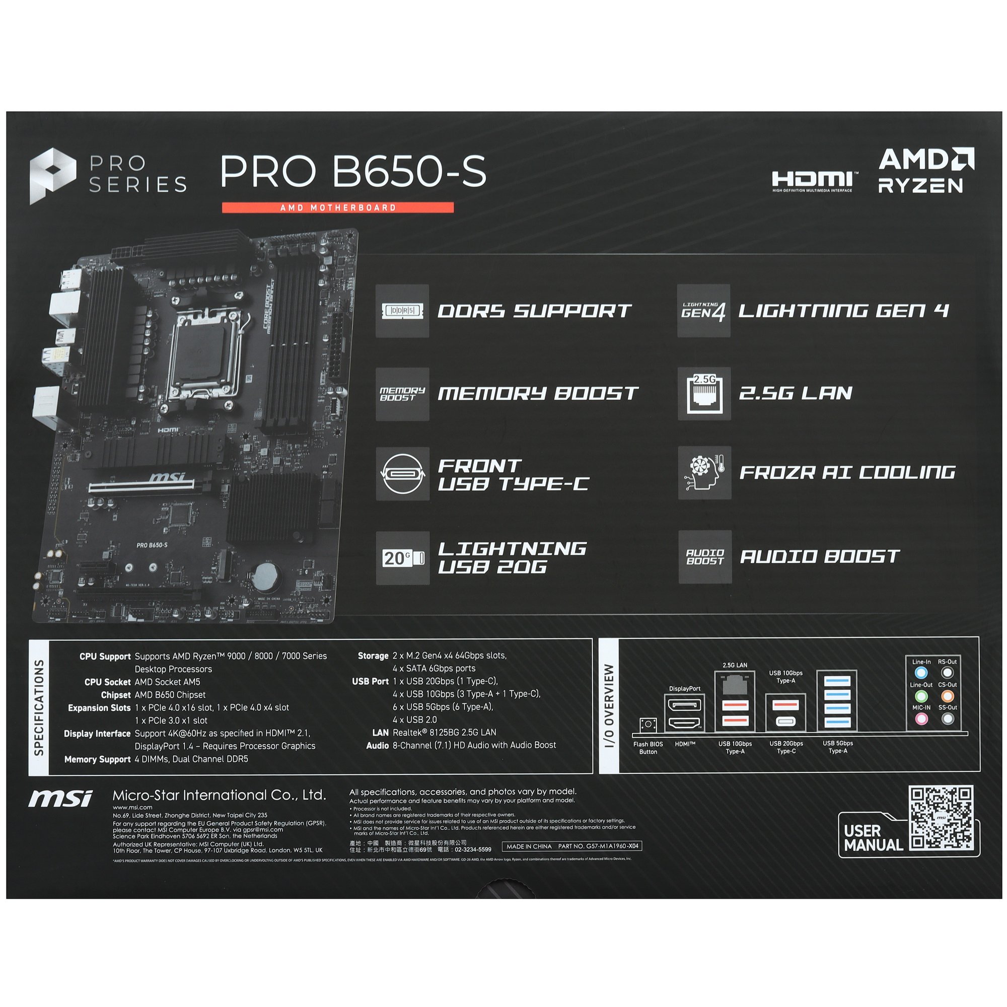 Материнская плата MSI PRO B650-S WIFI, AM5, AMD B650, 4xDDR5, 4xSATA, 2xM.2, 1xPCI-E 4.0 x16, 1xPCI-E 4.0 x4, 1xHDMI, 1xDP, 1x2.5Gb LAN, 3xUSB 3.2 Gen 1, 3xUSB 3.2 Gen 2, 6x3.5 мм, 7.1, Standard-ATX