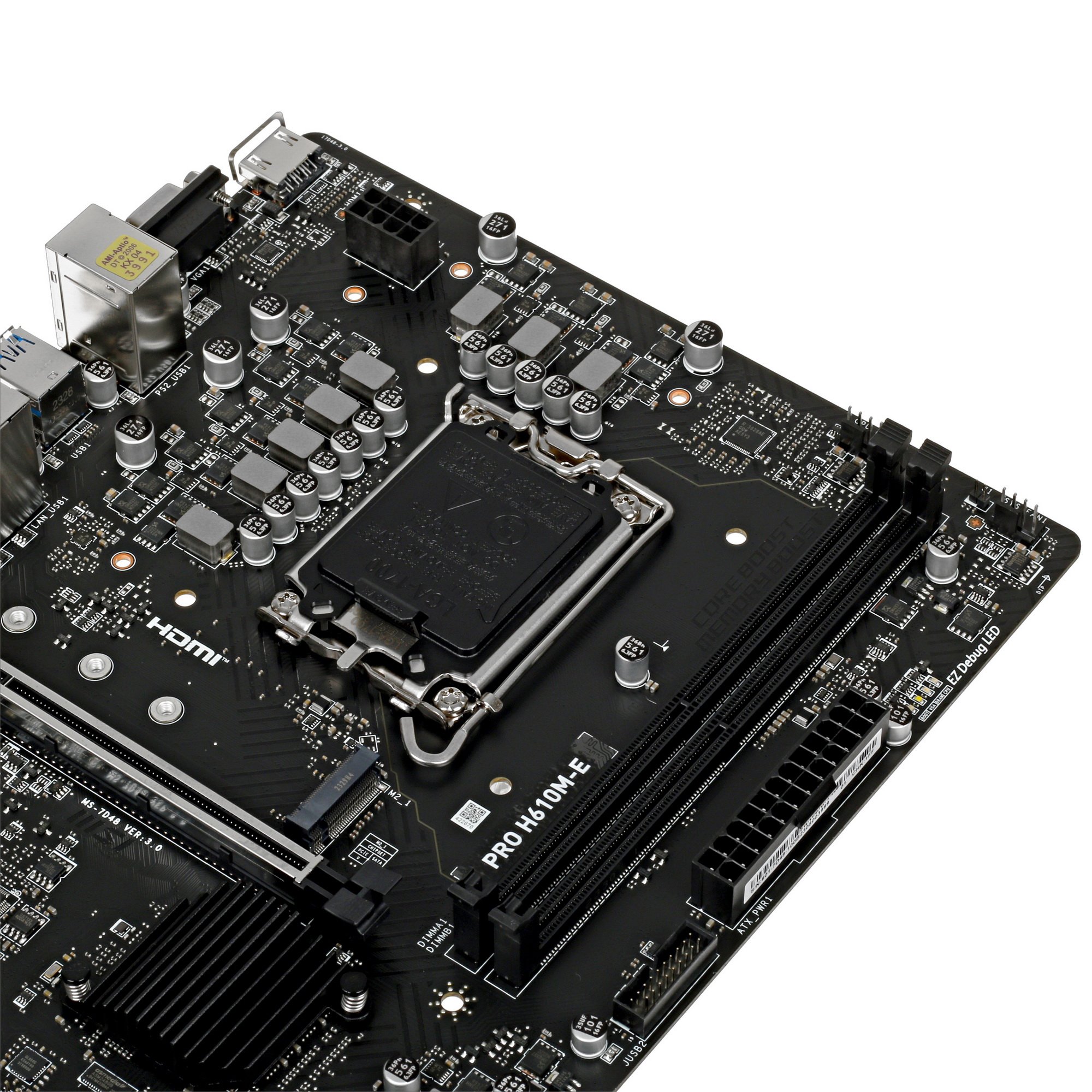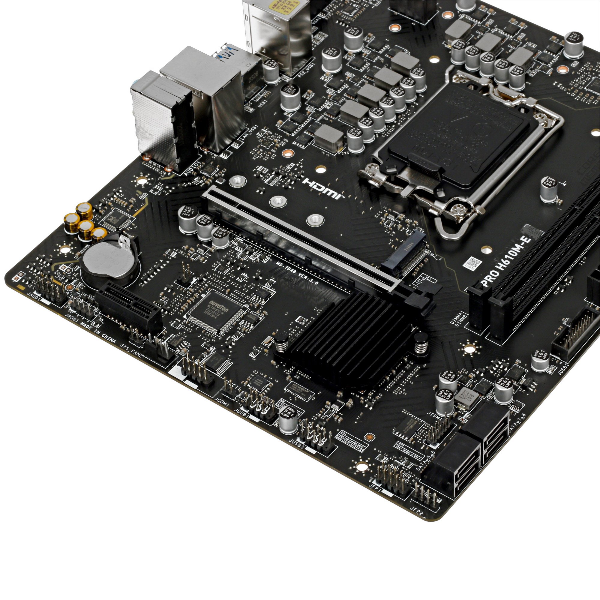 Материнская плата MSI PRO H610M-E DDR4, LGA 1700, Intel H610, 2xDDR4, 4xSATA, 1xM.2, 1xPCIe 4.0 x16, 1xPCIe 4.0 x1, 1xHDMI, 1xVGA, 1xRJ45 1Gb, 2xUSB-A 3.2 Gen 1, 4xUSB-A 2.0, 3x3.5мм, 7.1, mATX