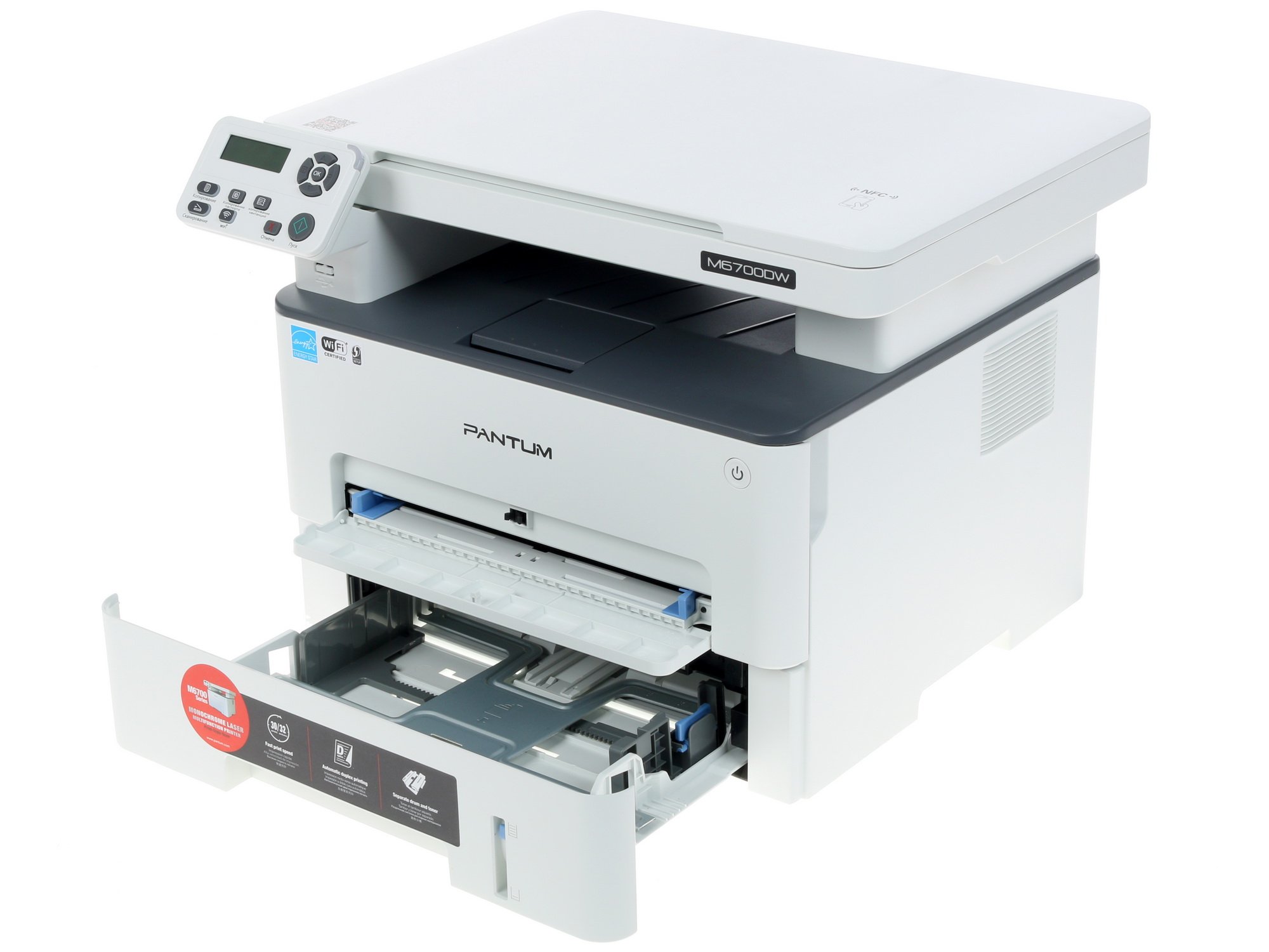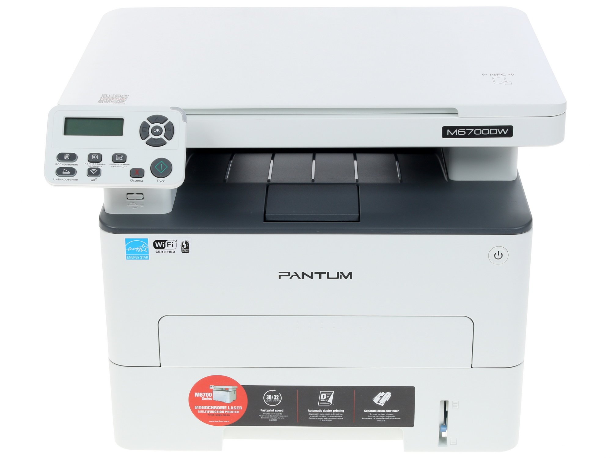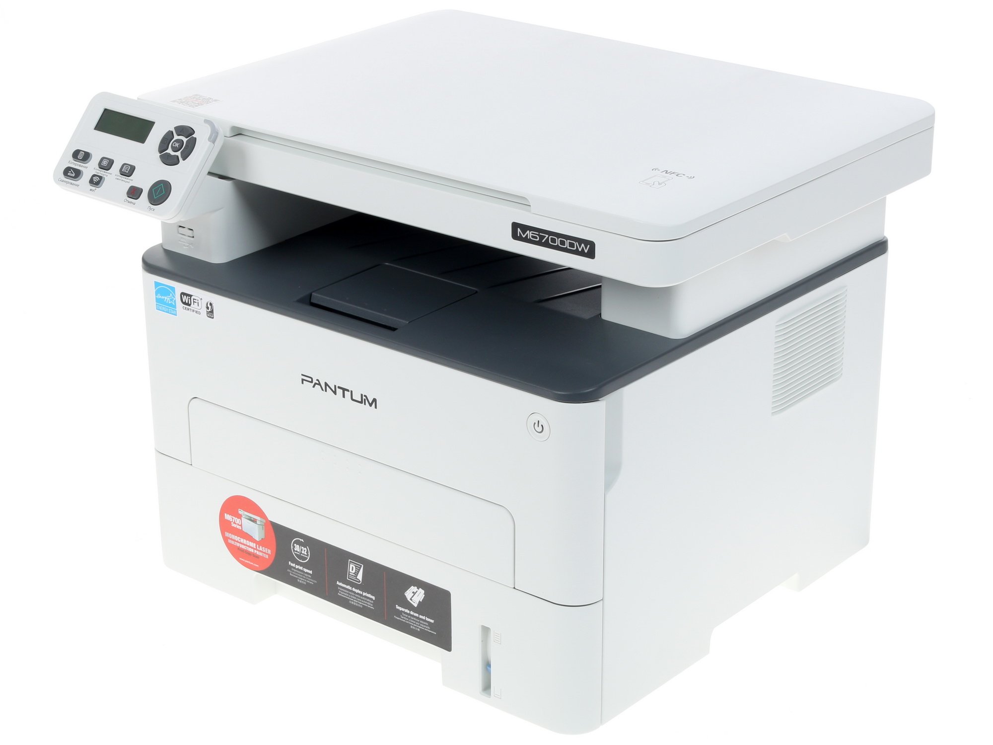 При печати производительность Pantum M6700DW составляет 30 стр/мин (А4). Особенность работы аппарата в режиме принтера состоит в в поддержке двусторонней печати, что обеспечивает экономию времени. Благодаря наличию модуля Wi-Fi при сканировании доступна отправка на FTP, а также сканирование на электронную почту или в сетевую папку. USB, Ethernet – разъемы, которые дают возможность синхронизировать МФУ с другими устройствами, чтобы передавать на него документацию.
