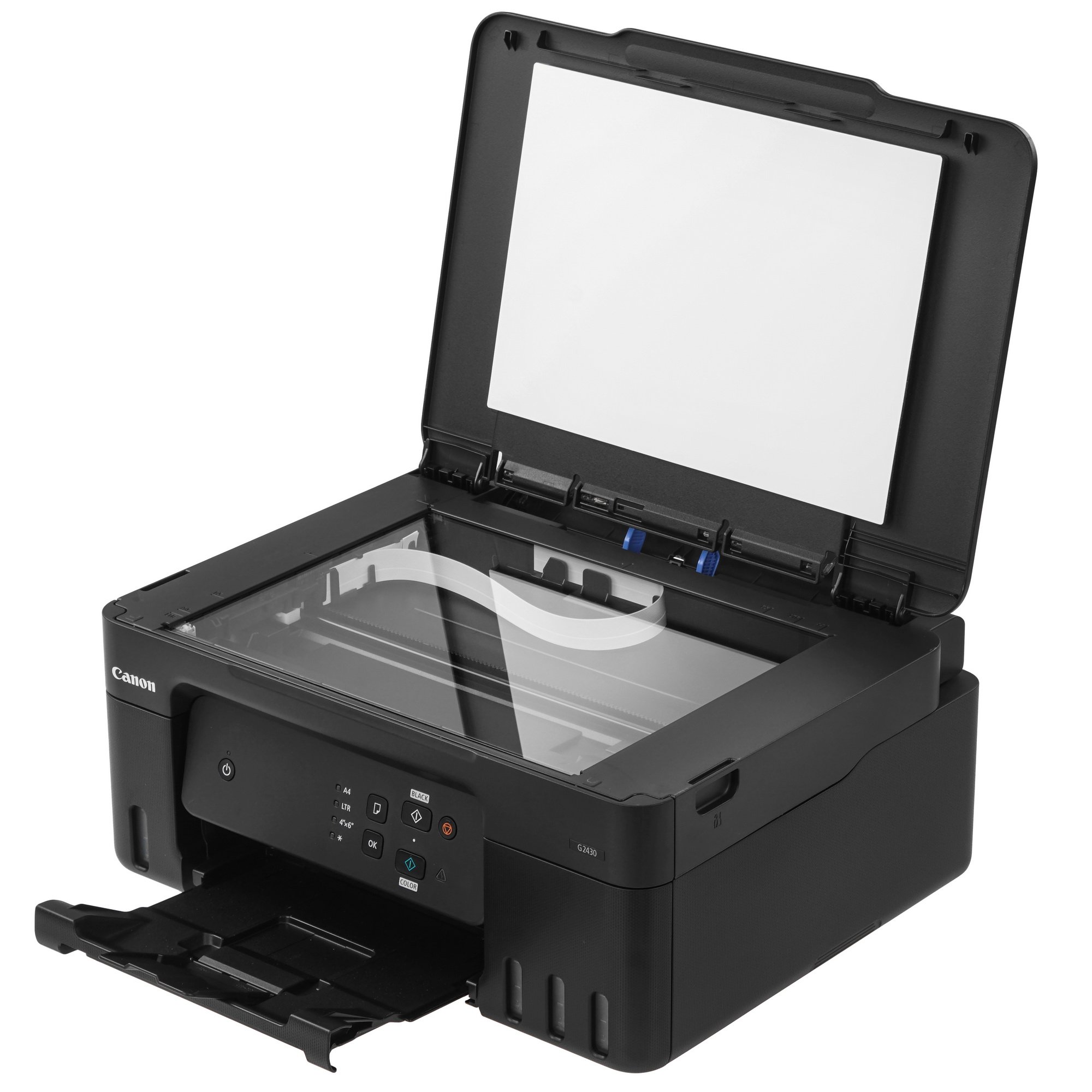 Canon PIXMA G2430 сканирует данные в память ПК. Во время работы модель использует глянцевую и матовую бумагу, конверты, открытки. Ресурс черного картриджа рассчитан на создание до 3100 копий, цветного – до 6000 страниц. Светодиодные индикаторы оповещают о заданном режиме работы.