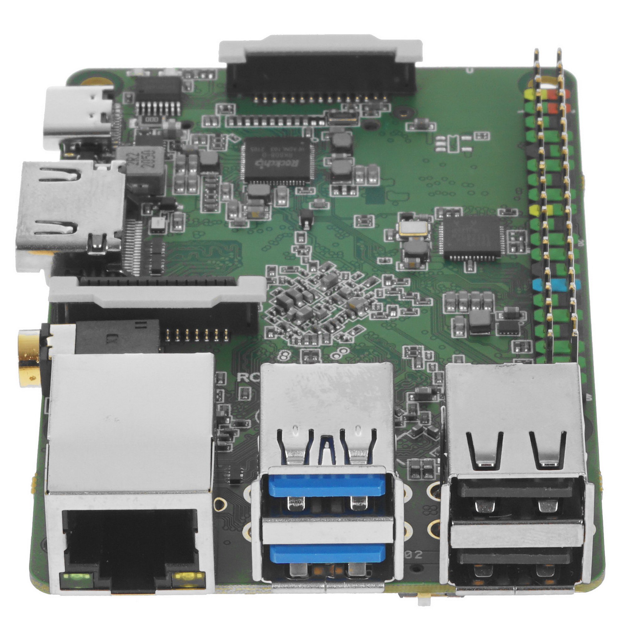 Микрокомпьютер ROCK Pi Model A 4GB RK3399 – модель высокопроизводительного устройства в сверхкомпактном форм-факторе. Основой микрокомпьютера является 6-ядерный процессор Rockchip RK3399 с интегрированным видеочипом ARM Mali-T860. Также данная модель получила 4 ГБ памяти стандарта LPDDR4. Из интерфейсов в ROCK Pi Model A имеются видеовыход HDMI, порты USB Type-C и USB Type-A, аудиоразъем, считыватель карты памяти. Среди других особенностей микрокомпьютера отмечаются слот M.2 (PCI-E) и коннектор LAN для организации проводного подключения к сети Интернет.