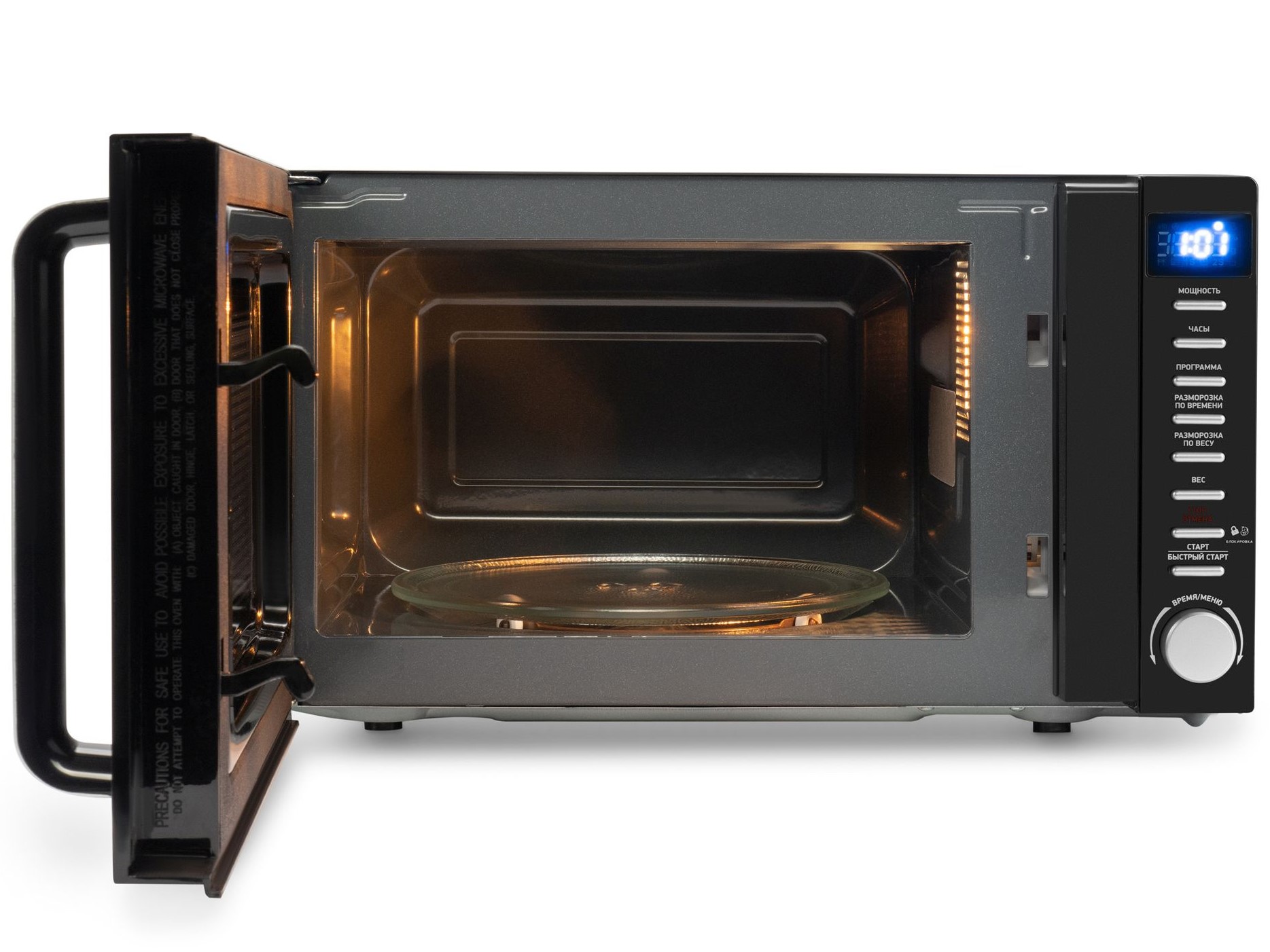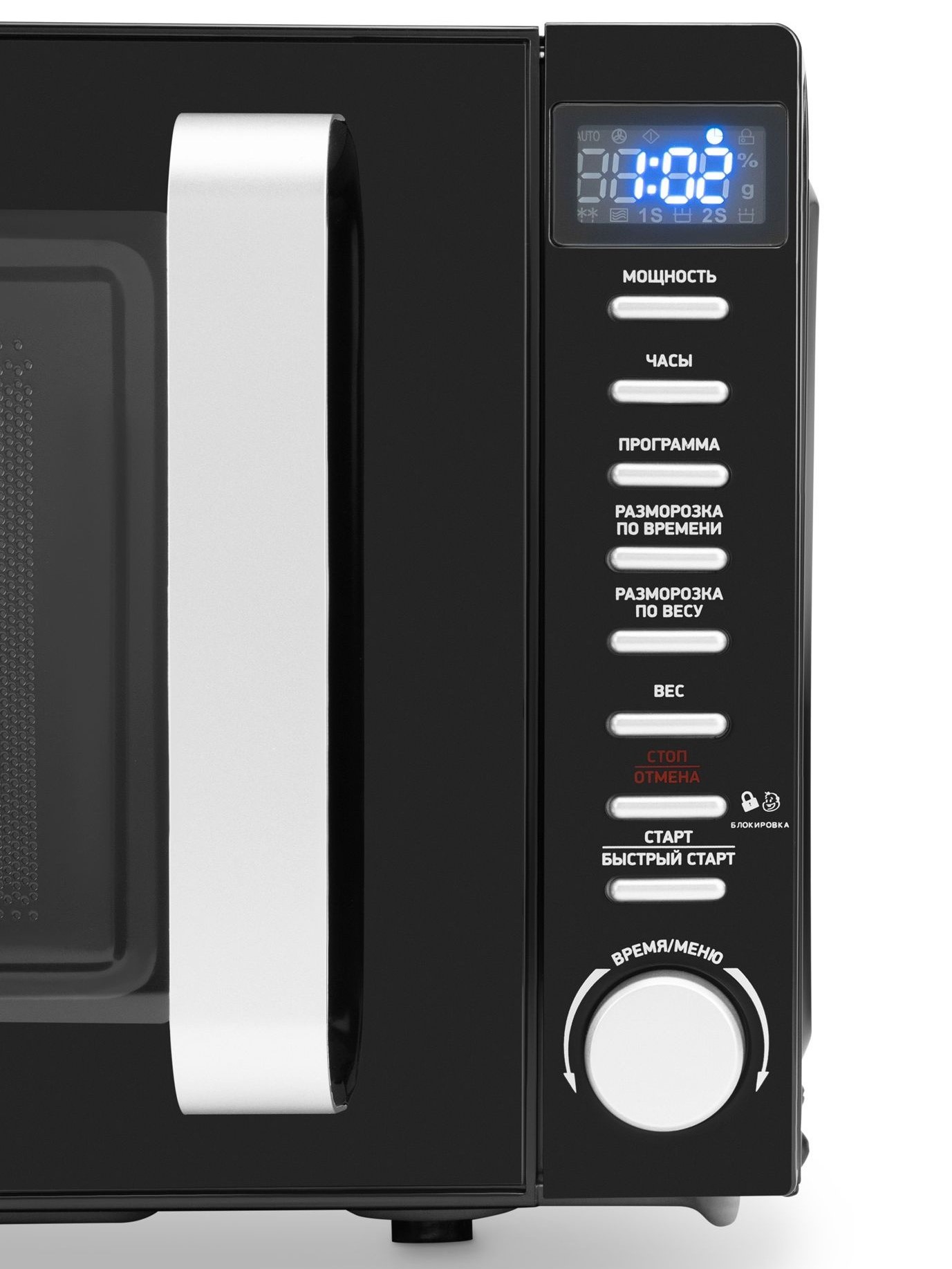 Hyundai HYM-D3034 - микроволновая печь в невероятно стильном и практичном черном корпусе с хромированной ручкой на дверце. Она прекрасно впишется в любой интерьер. Микроволновка обладает вместительной внутренней камерой на 20 л. Этого объема с запасом хватит для приготовления и быстрого разогрева домашних блюд в небольшой семье. Модель оснащена поворотным столиком диаметром 24,5 см, который подойдет и для большой посуды. За счет вращения пища подогревается равномерно. Внутренняя подсветка позволит следить за процессом приготовления еды. Мощность микроволновой печи составляет 700 Вт, предусмотрено пять режимов работы. Модель Hyundai HYM-D3034 поможет быстро разморозить продукты, разогреть готовые блюда или приготовить несложные закуски типа печеного картофеля, попкорна или пиццы. Предусмотрен таймер на 99 минут. Он оповестит звуковым сигналом о готовности блюда. Электронная система управления состоит из удобного поворотного переключателя, кнопочного меню с широким функционалом и аккуратного дисплея, на котором легко контролировать все настройки.