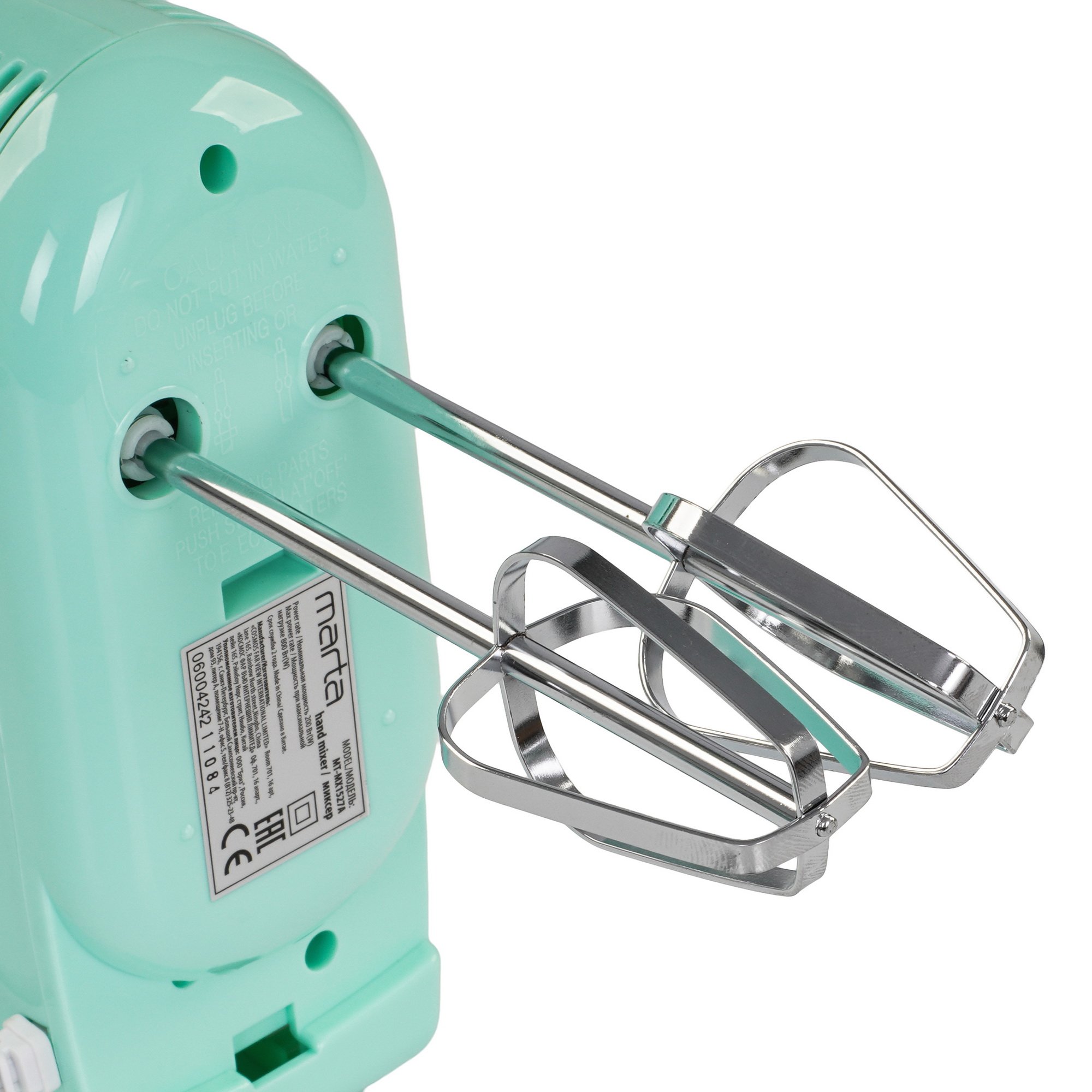 С помощью позиционного переключателя устанавливается скоростной режим из 7 доступных. Сменные насадки изготовлены из нержавеющей стали. Они устойчивы к повреждениям и не подвержены образованию коррозии. Отсоединение насадок от миксера MARTA MT-MX1527A выполняется нажатием кнопки.