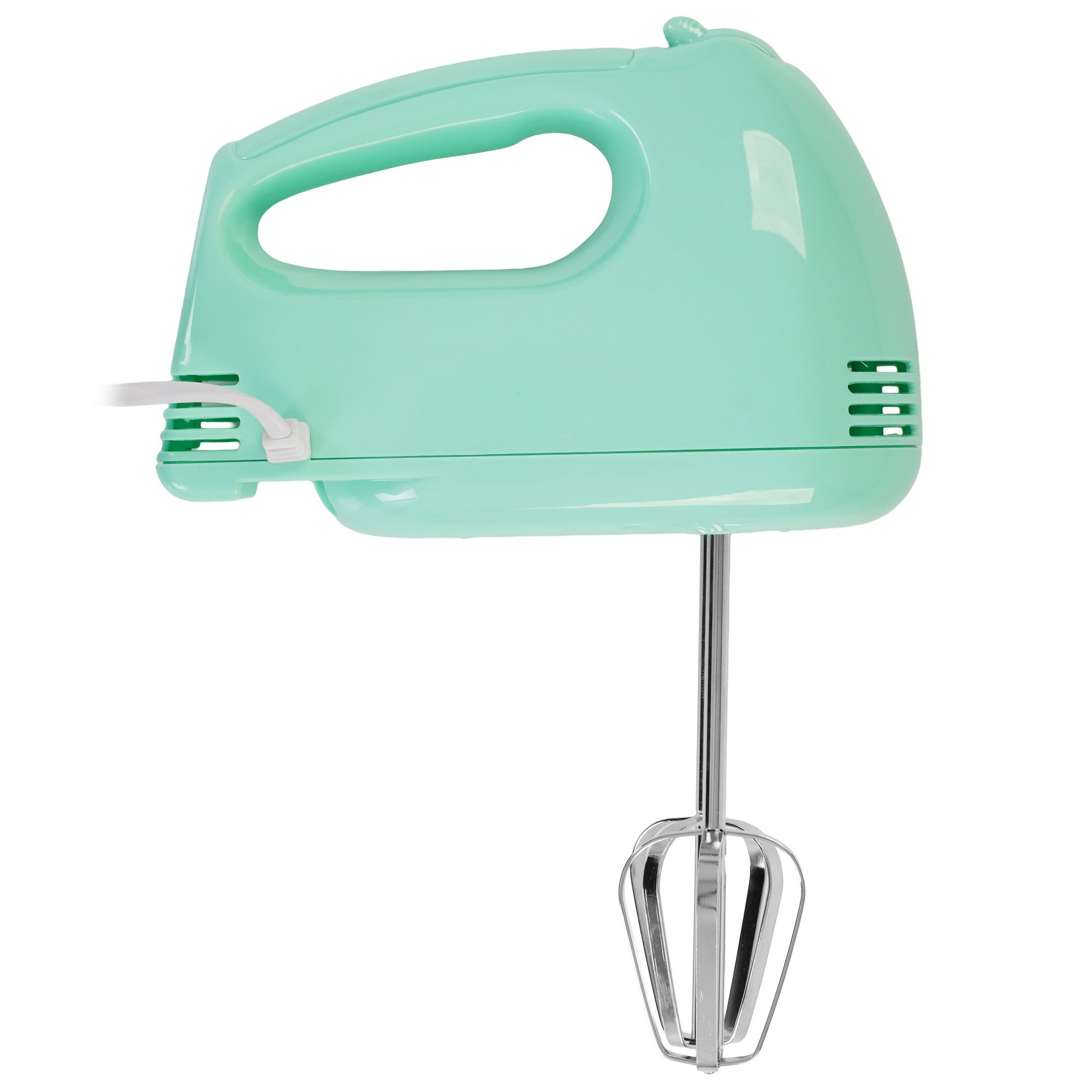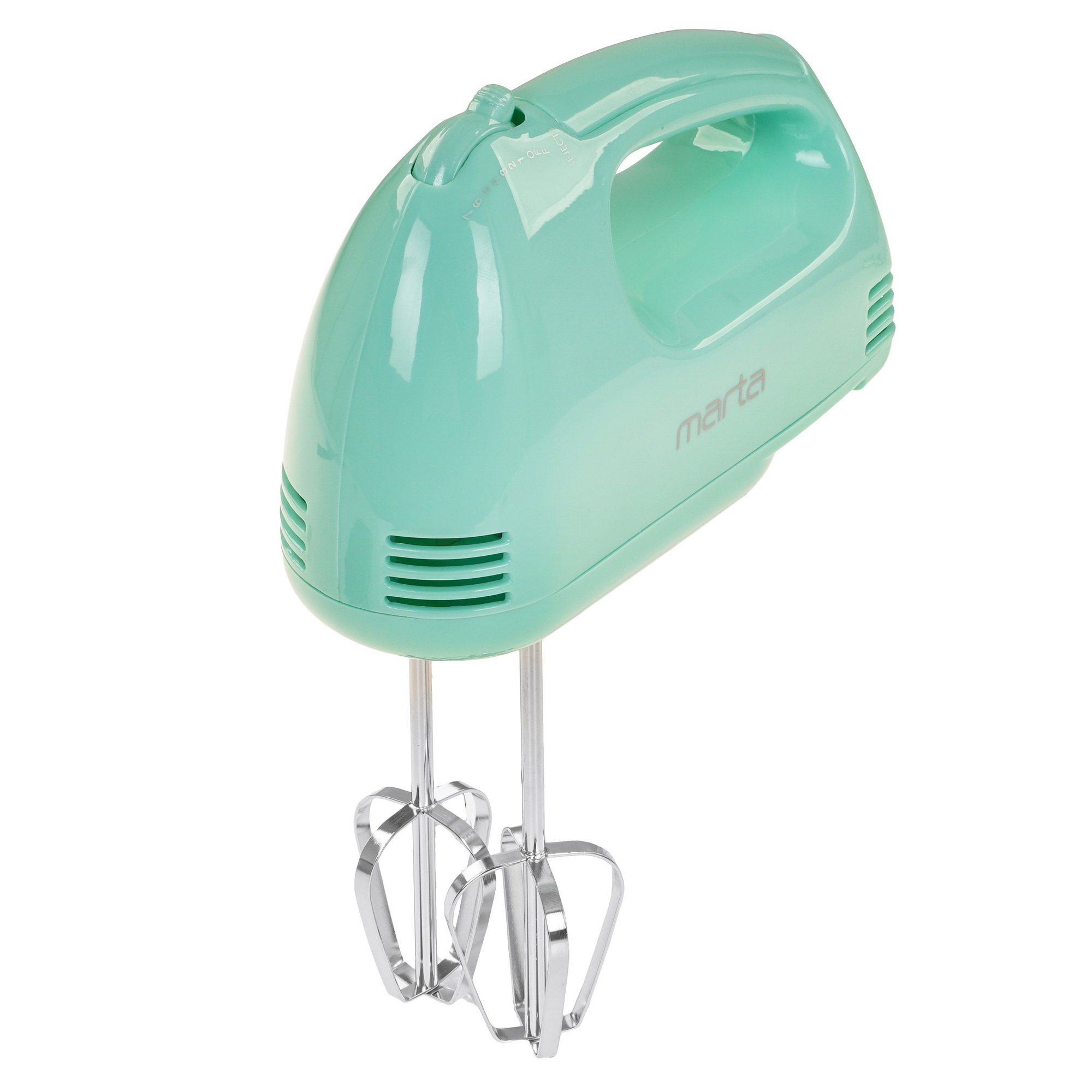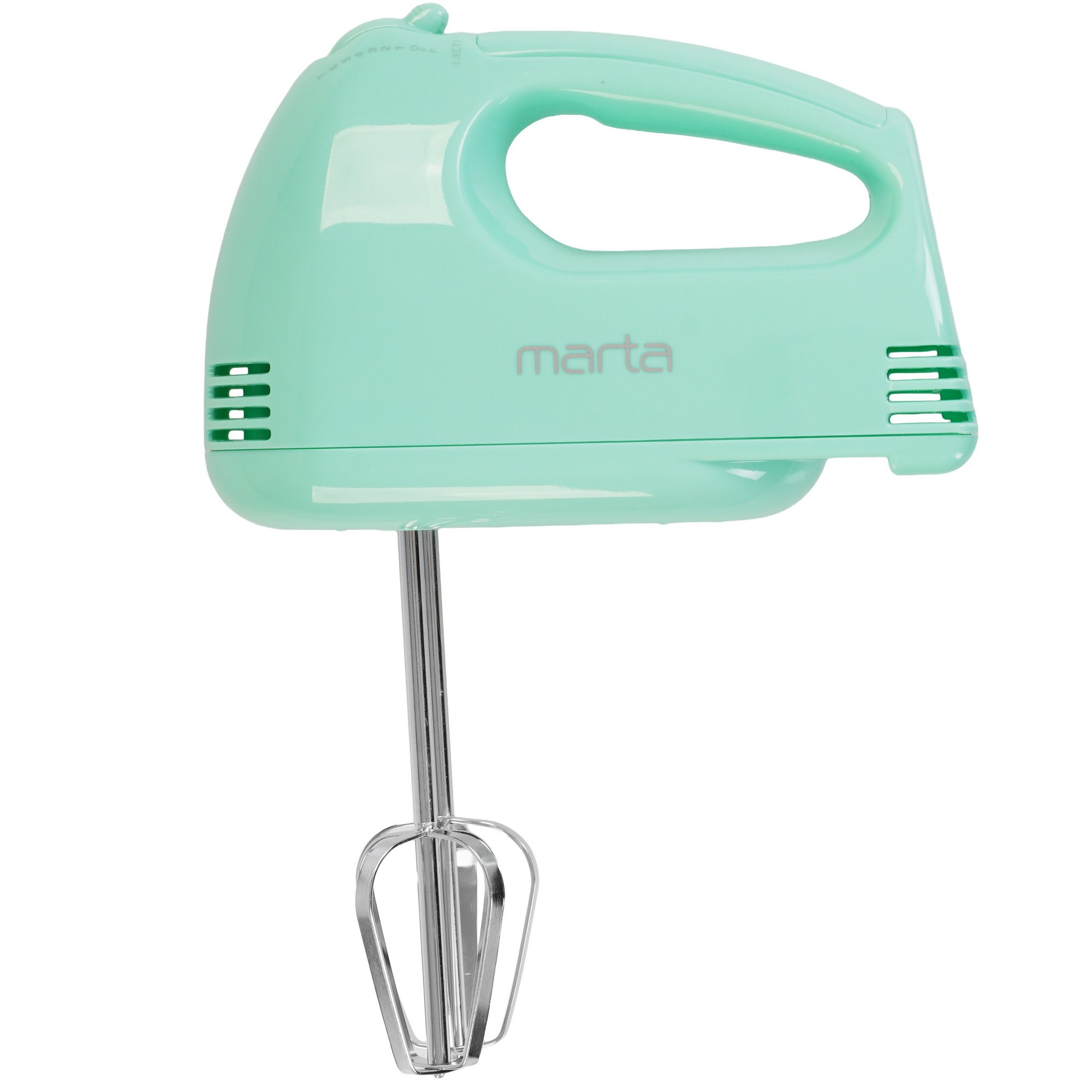 Миксер MARTA MT-MX1527A выполнен в пластиковом корпусе зеленого цвета. Благодаря мощности 550 Вт и скорости вращения насадок до 1500 об/мин он тщательно перемешивает ингредиенты. Насадки-венчики взбивают белки яиц, сливки и другие продукты в однородную воздушную массу. Для замешивания жидкого и вязкого теста предусмотрены насадки-крюки.