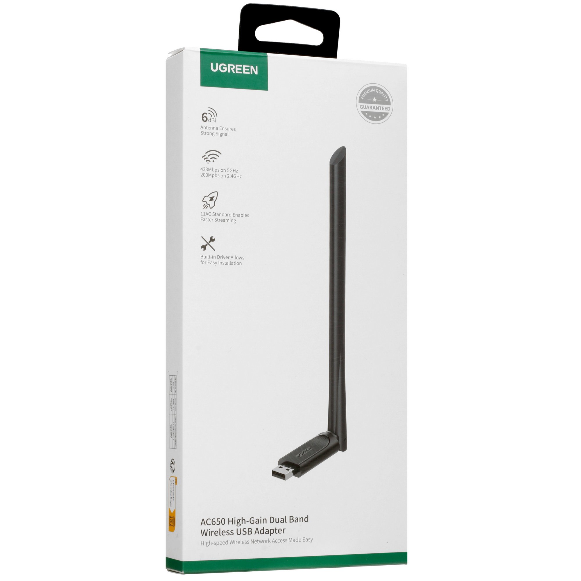 Wi-Fi адаптер UGREEN CM496 с USB-интерфейсом может использоваться с любыми компьютерами на основе операционных систем Linux и Windows. Это устройство позволяет обеспечить их беспроводным доступом в интернет. Для этого у него есть внешняя несъемная антенна и передатчик мощностью до 20 дБм. Одновременно адаптер может функционировать в 2 диапазонах: 2.4 и 5 ГГц. Максимальная скорость Wi-Fi-соединения с использованием UGREEN CM496 достигает показателя 633 Мбит/с. Защита беспроводной сети выполняется по стандартам WEP, WPA-PSK, WPA2-PSK.