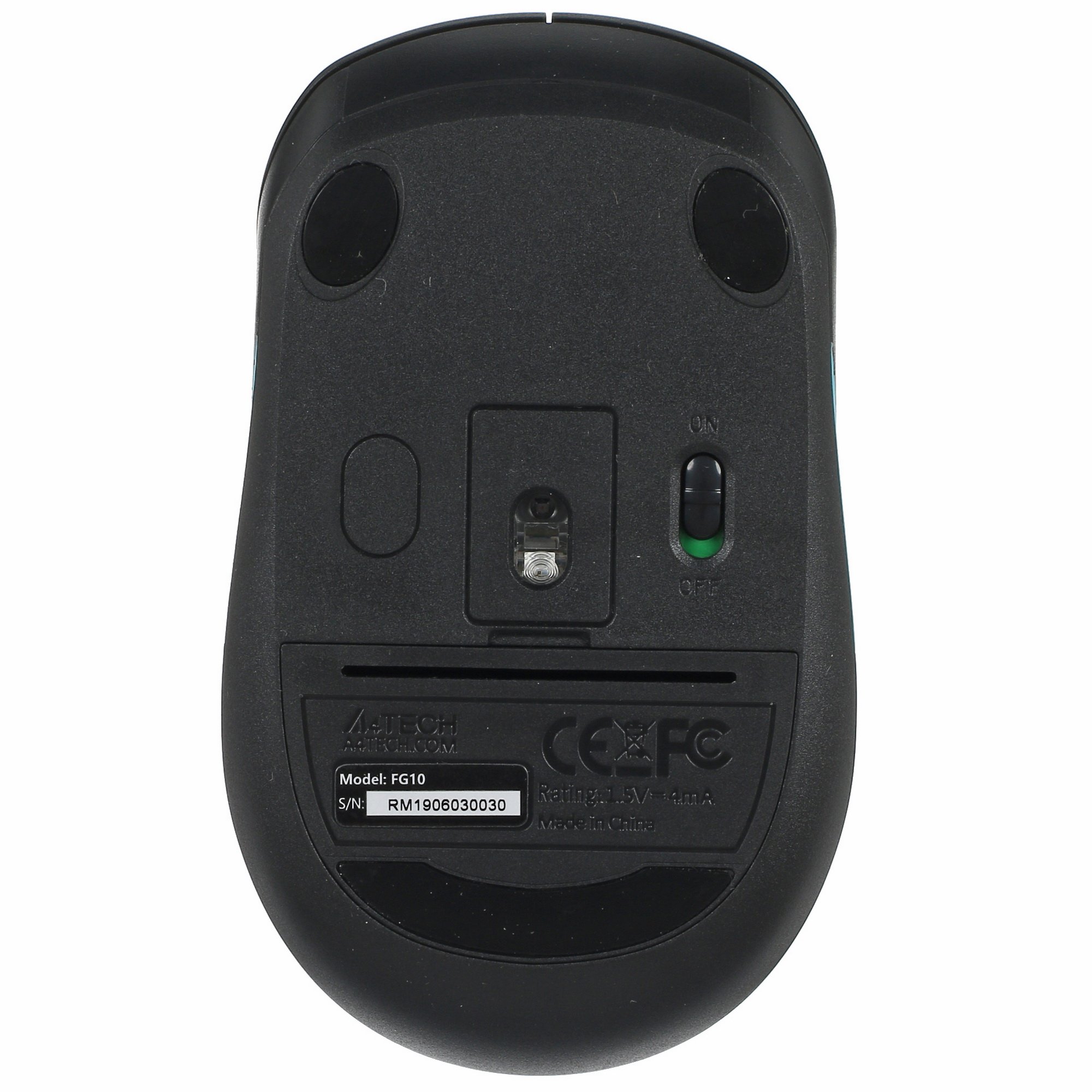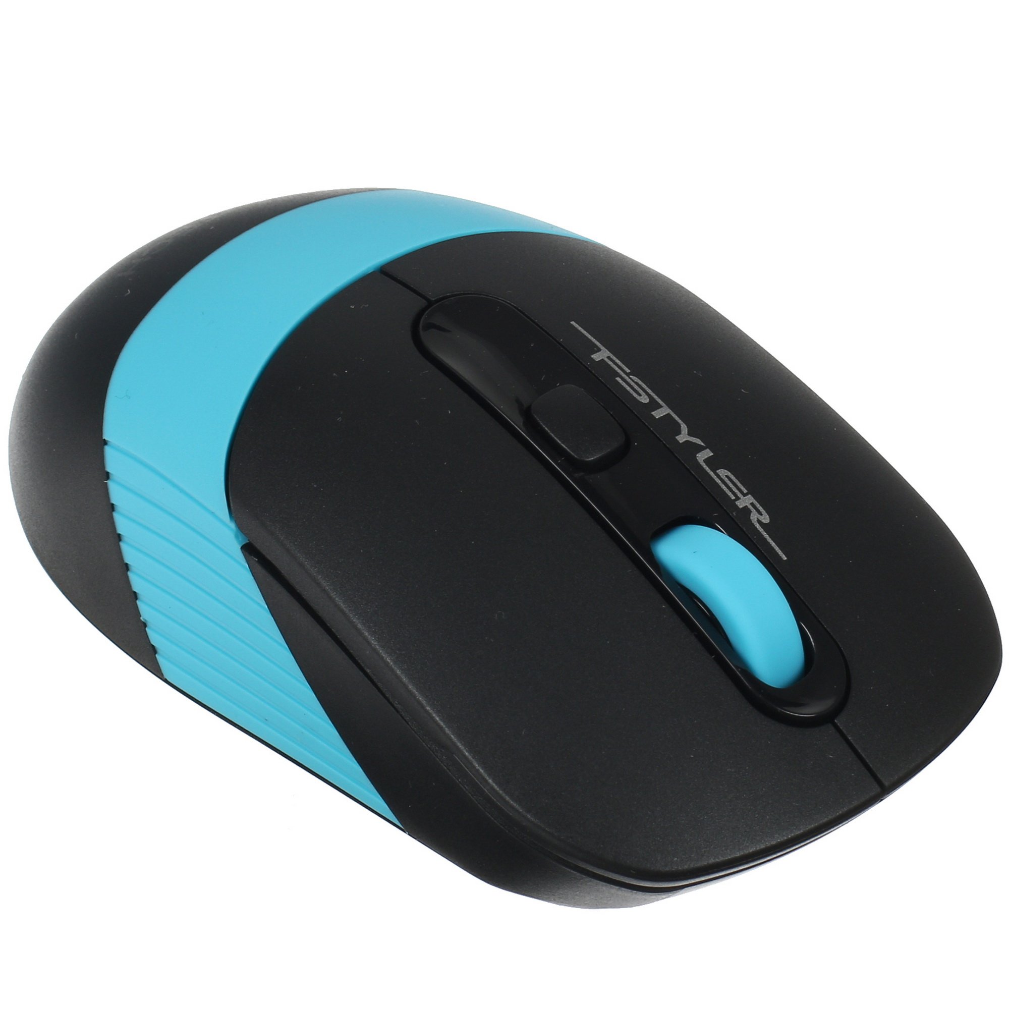 Мышь беспроводная A4Tech FStyler FG10 – это компактная модель, подходящая для работы как левой, так и правой рукой. Ее корпус выполнен из качественного ABS-пластика c прорезиненной полоской голубого цвета, препятствующей скольжению. Из такого же материала выполнено и колесо прокрутки. На нижней поверхности есть отсек для пальчиковой батарейки и USB-приемника.