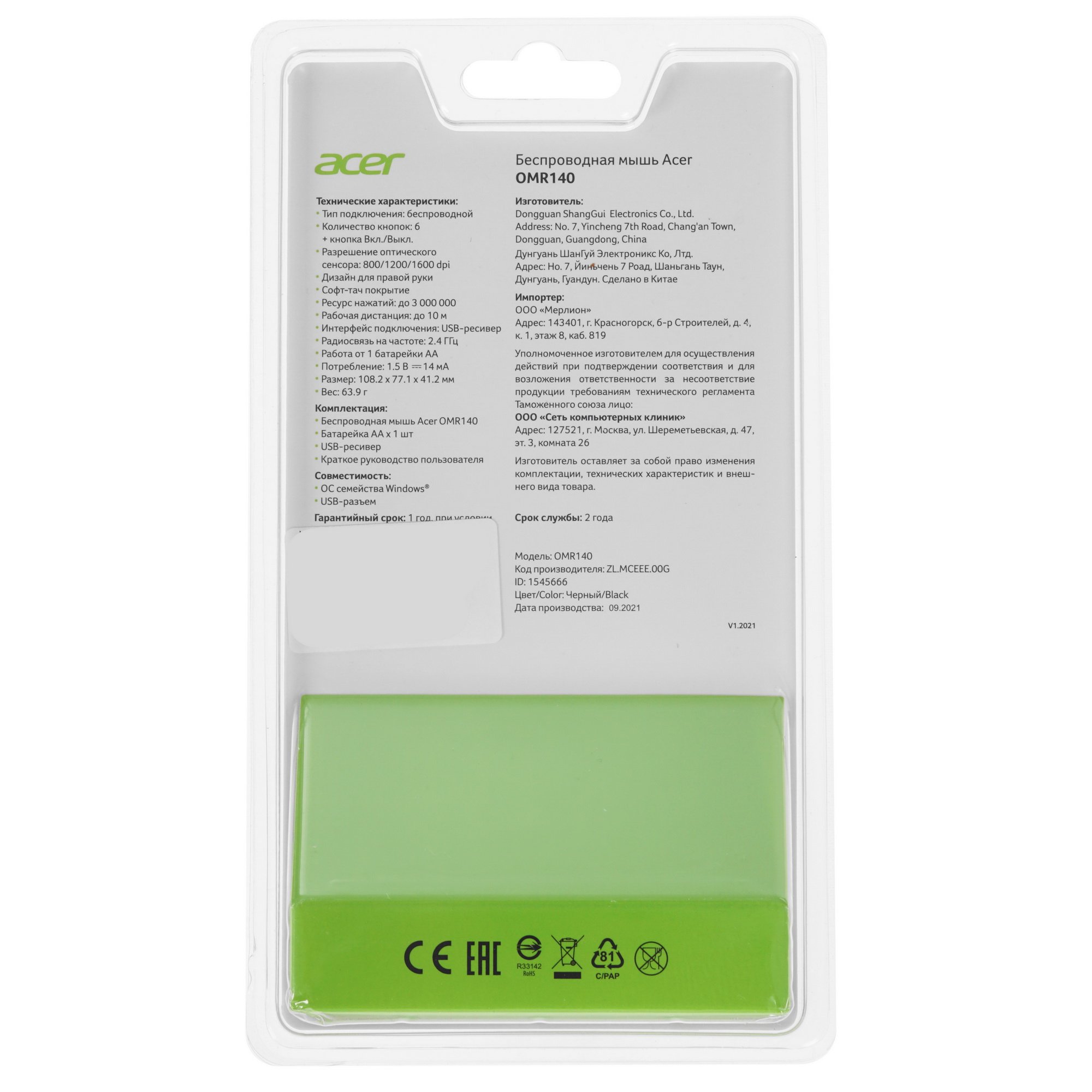 Мышь беспроводная Acer OMR140 черный, 1600 dpi, радиоканал, USB, кнопки - 6