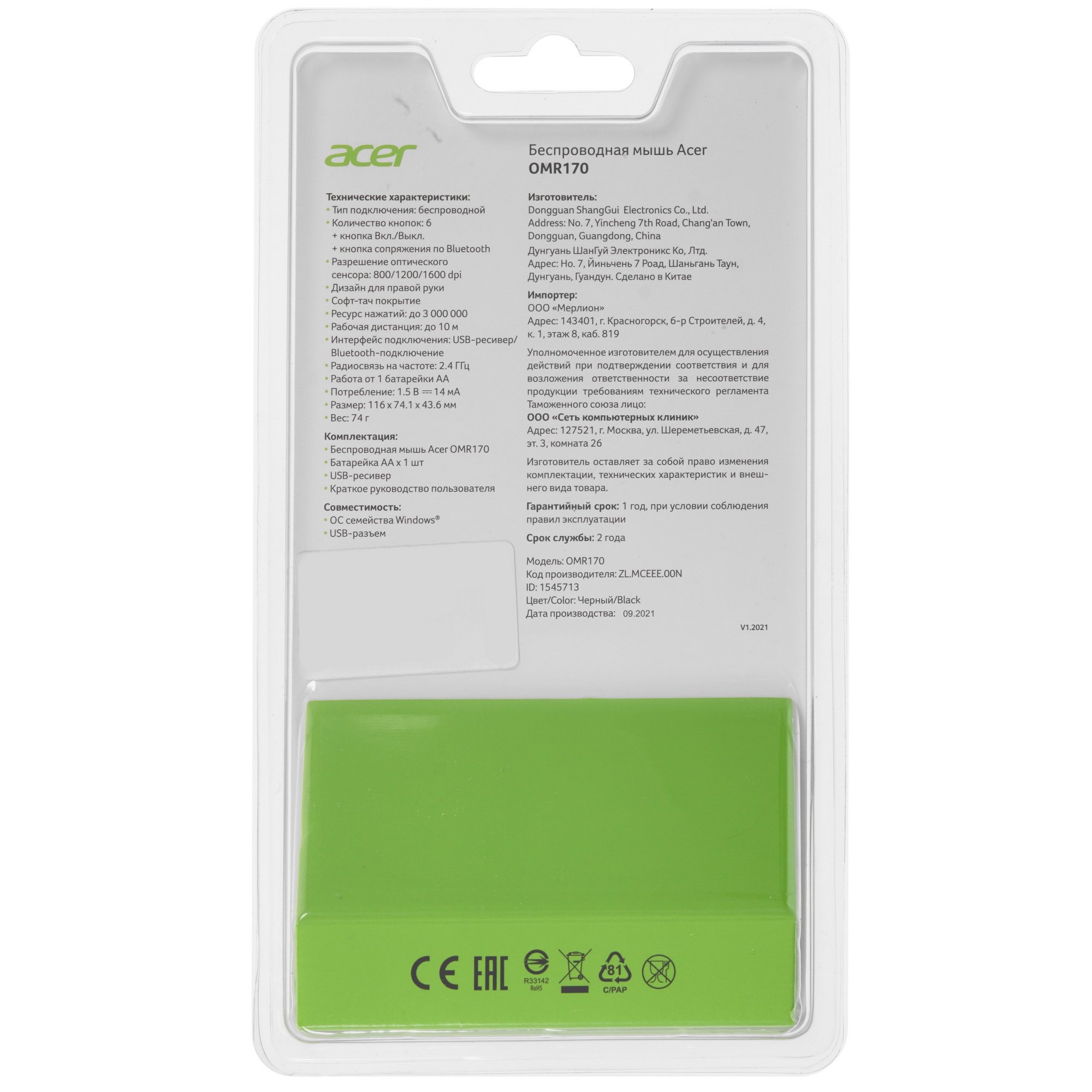 Мышь беспроводная Acer OMR170 черный, 1600 dpi, радиоканал, Bluetooth, USB, кнопки - 6