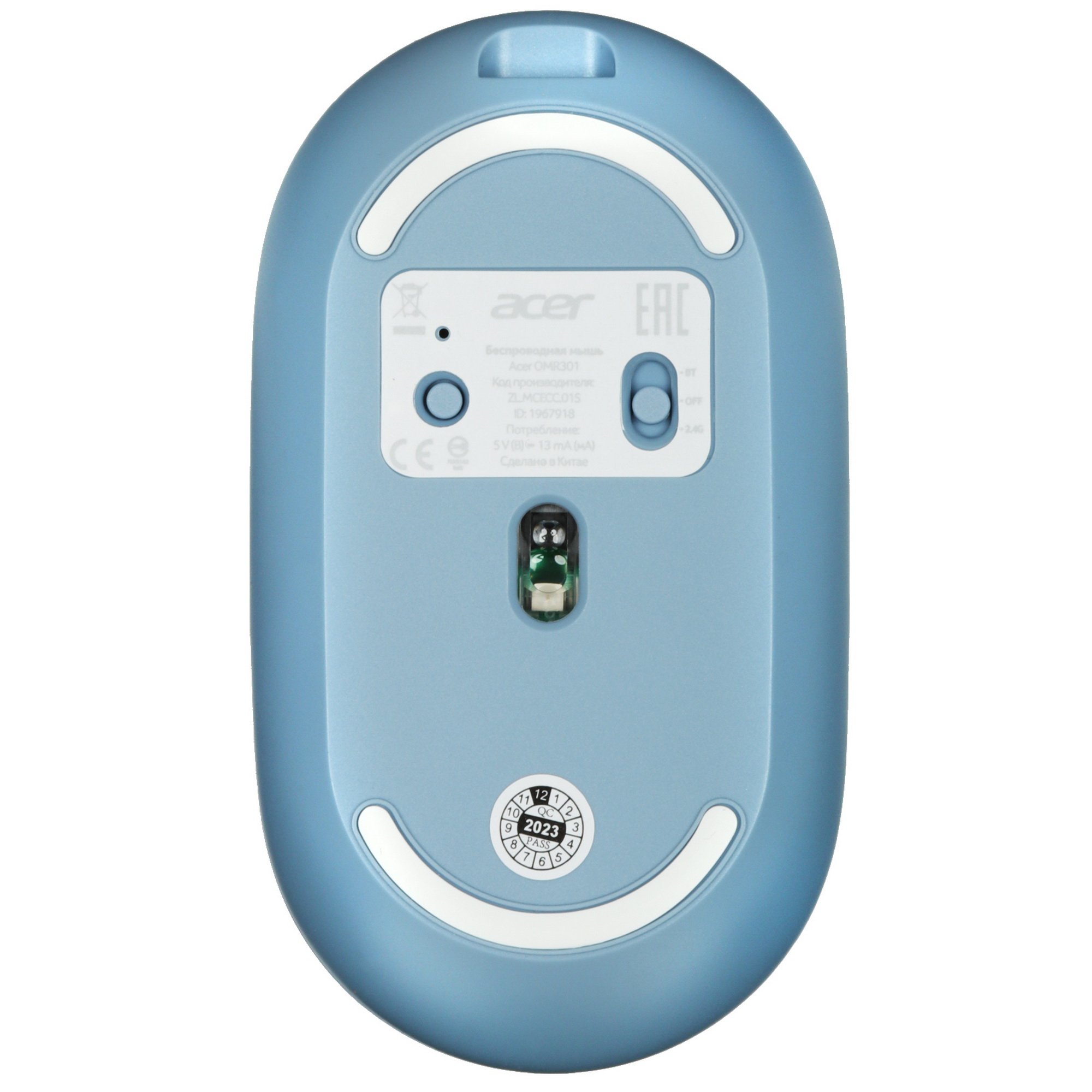 Мышь беспроводная Acer OMR301 [ZL.MCECC.01S] оборудована 4 кнопками, не издающими звуков во время нажатия. Аксессуар заключен в пластиковый корпус голубого цвета с матовым покрытием, которое предупреждает накапливание загрязнений и проскальзывание ладони при управлении.