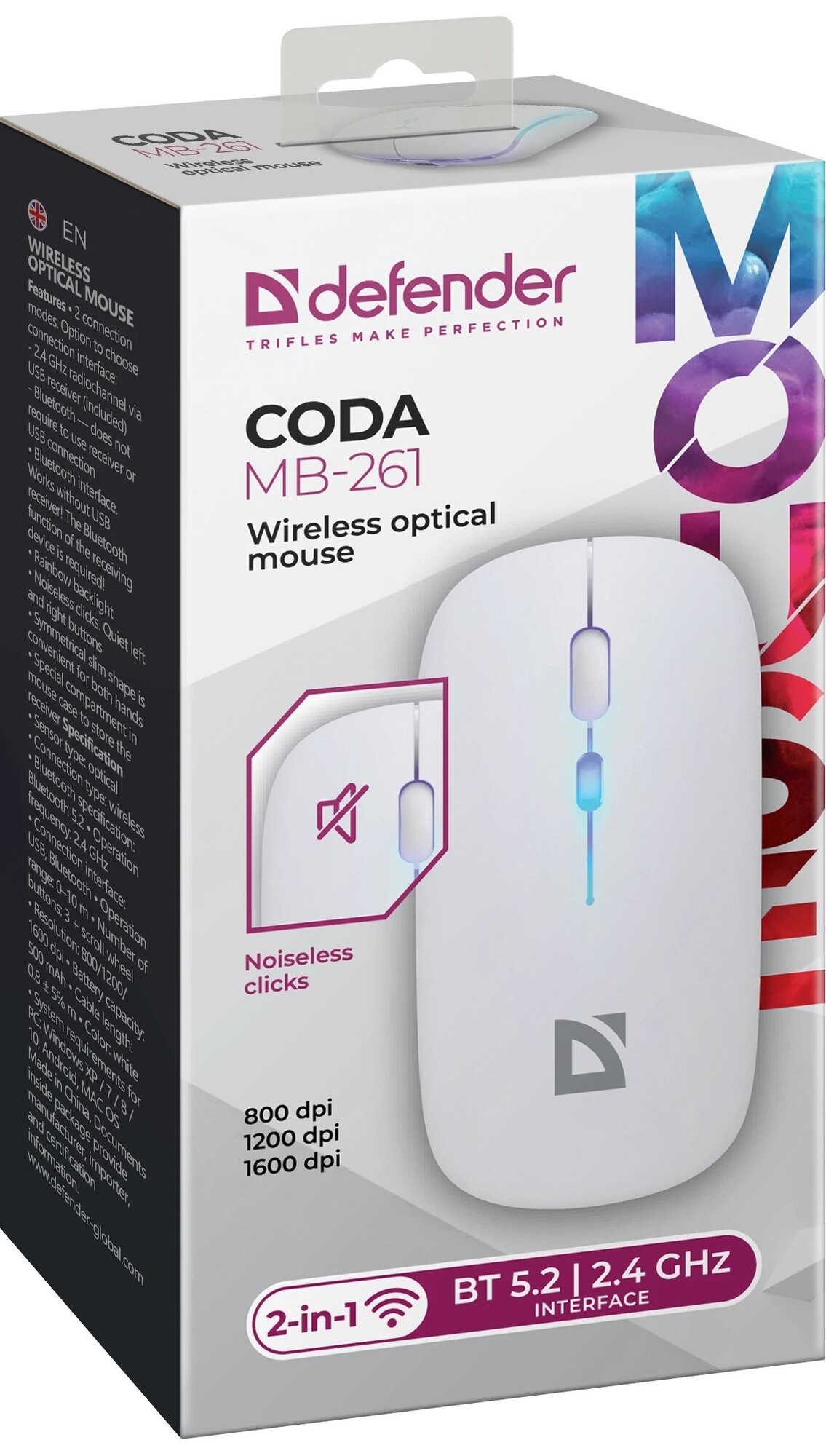 Беспроводная ультратонкая мышь Defender Coda MB-261 обладает радужной подсветкой, встроенным аккумулятором и двумя режимами подключения: по радиоканалу 2,4ГГц и по Bluetooth. Модель имеет симметричную форму, удобную для работы любой рукой.