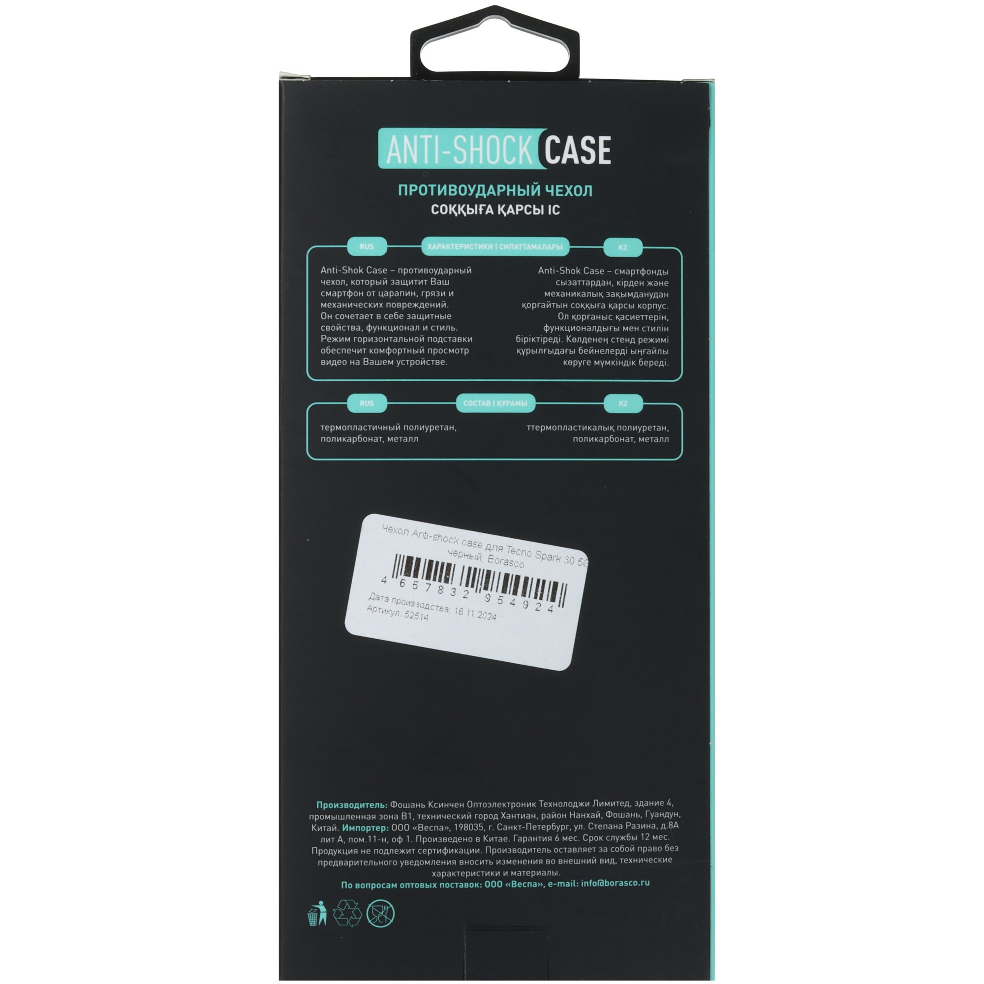 Накладка BoraSCO Anti-Shok Case для Tecno SPARK 30 5G выполнена из поликарбоната для повышенной защиты устройства от повреждений. Это снижает риск поломки при случайном ударе и падении смартфона на пол. Чехол плотно облегает корпус для защиты от царапин, потертостей, попадания пыли и брызг. Предусмотрены отверстия для свободного доступа к камере и разъемам.