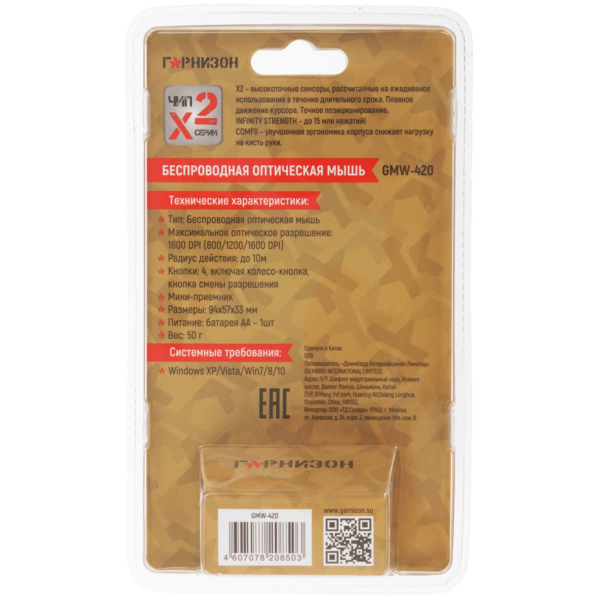 Плавное скольжение и точное наведение курсора гарантирует оптический светодиодный сенсор. Гарнизон GMW-420 подключается к ПК, ноутбуку, телевизору с помощью USB-ресивера. Для автономной работы требуется установка батарейки типа АА.