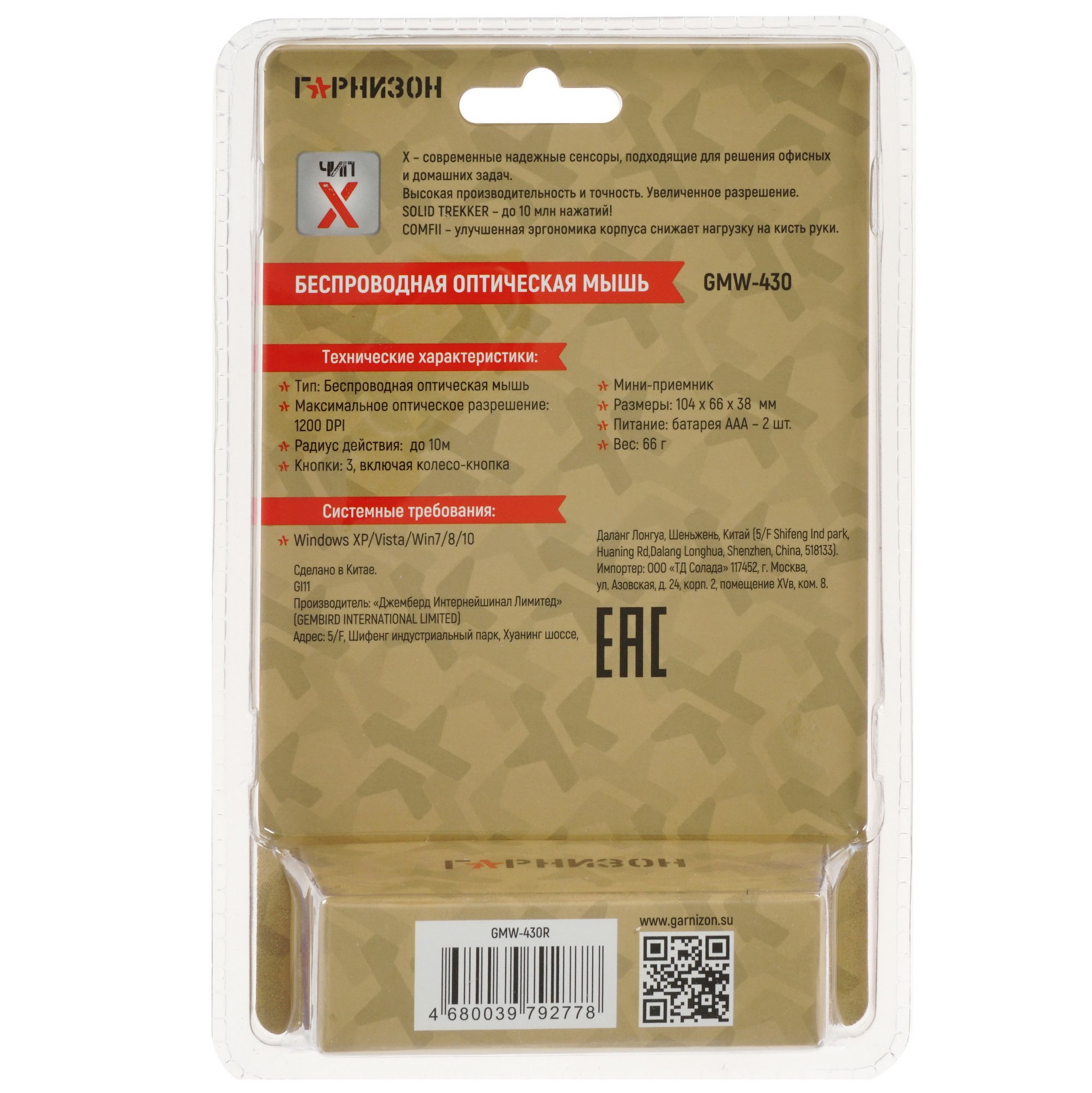 Мышь беспроводная Гарнизон GMW-430R красный, 1200 dpi, радиоканал, USB, кнопки - 3