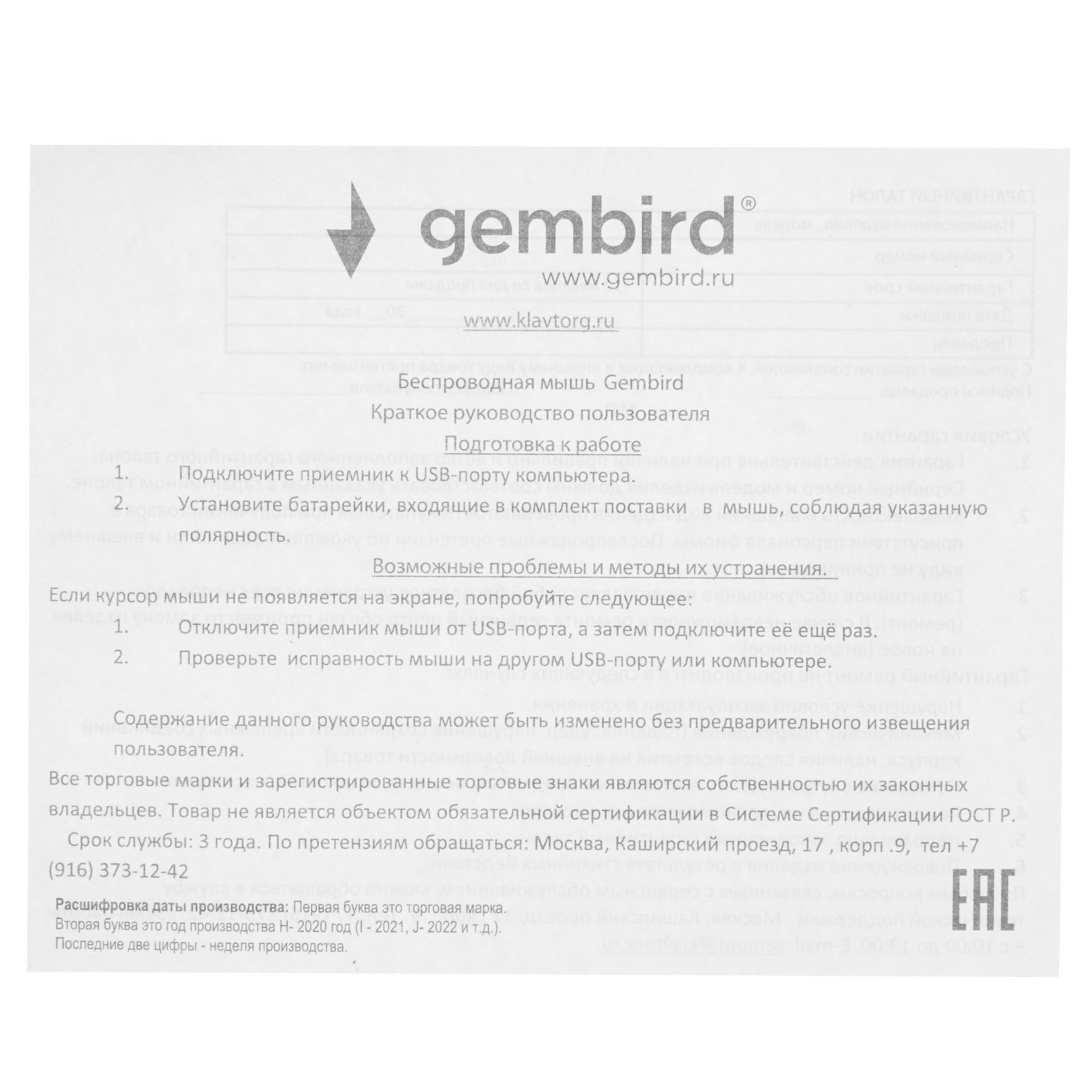 Беспроводная мышь для ПК или ноутбука Gembird MUSW-250-2 подходит для использования не только на специальном коврике, но и на ровной поверхности. Для питания устройства ввода используется одна батарейка АА (вошла в комплект).