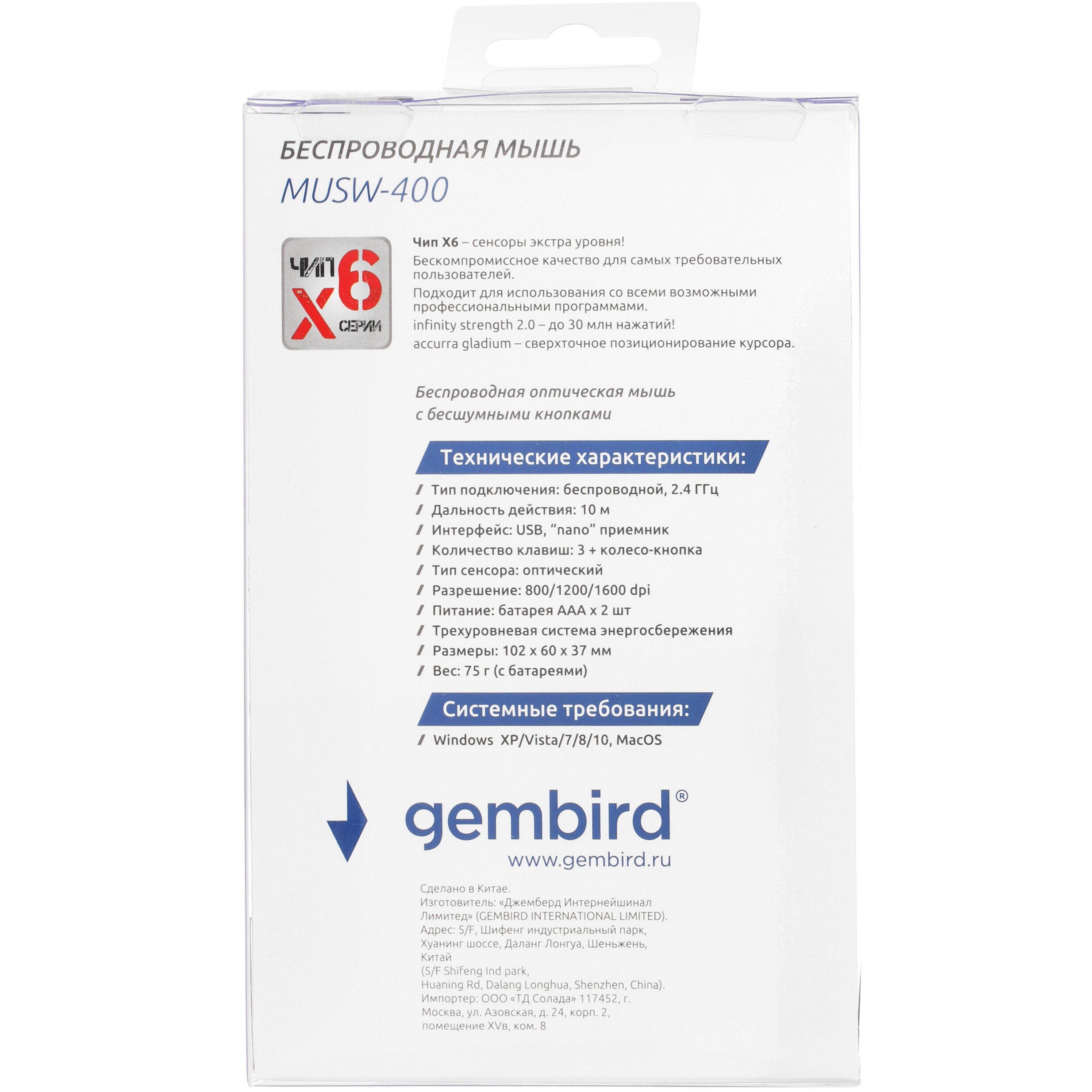 Функционирует мышь Gembird MUSW-400-G от батареек, что позволяет избавиться от проводов, используя устройство в радиусе 10 метров от компьютера. Ресивер USB используется для подключения к разъему компьютера: он служит связующим звеном между мышью и устройством. Беспроводная мышь отличается поддержкой трехуровневой системы, позволяющей экономить энергию, благодаря чему батарейки будут работать намного дольше. Бесшумный клик способствует комфортной эксплуатации манипулятора.