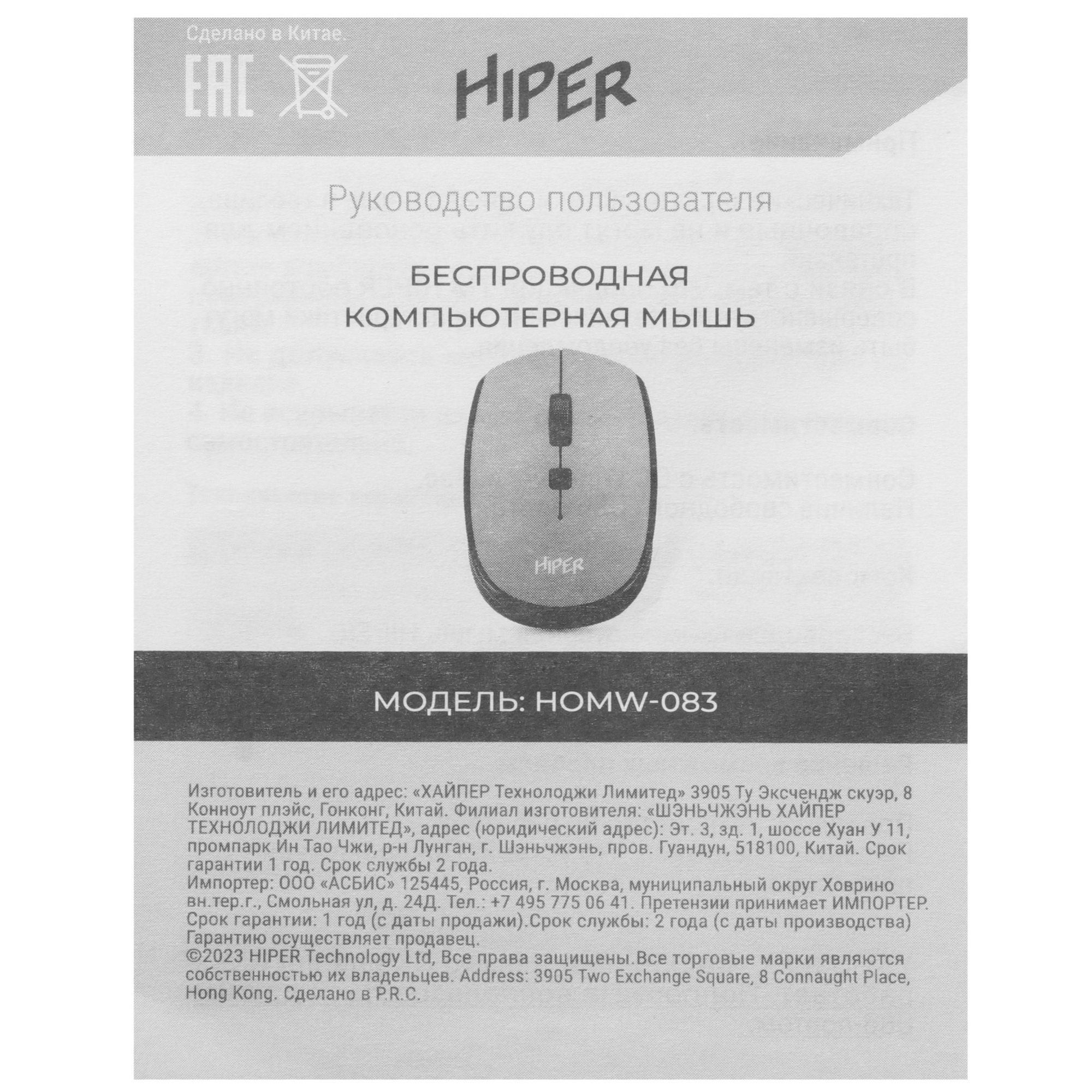 Hiper HOMW-084 работает дистанционно ‒ через радиоканал. Модель подключается к устройству при помощи USB-ресивера с интерфейсом USB Type-A. Устойчивый сигнал сохраняется в радиусе 10 м. В нижней части корпуса находится отсек для батарейки АА.