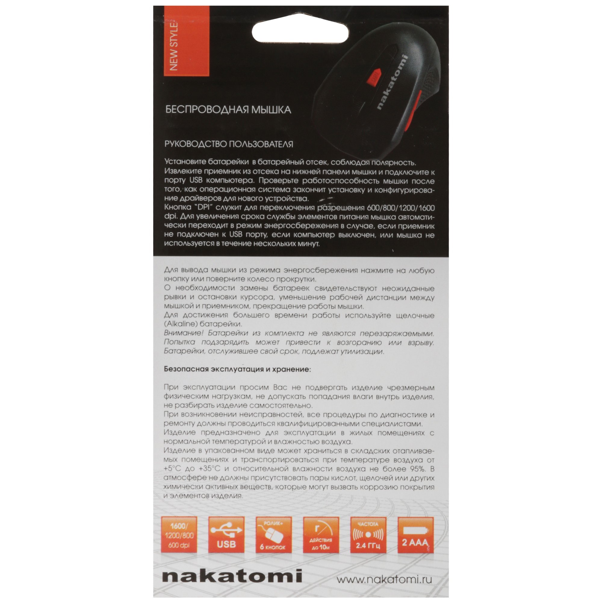 Мышь беспроводная Nakatomi MRON-07U черный, 1600 dpi, радиоканал, USB, кнопки - 5
