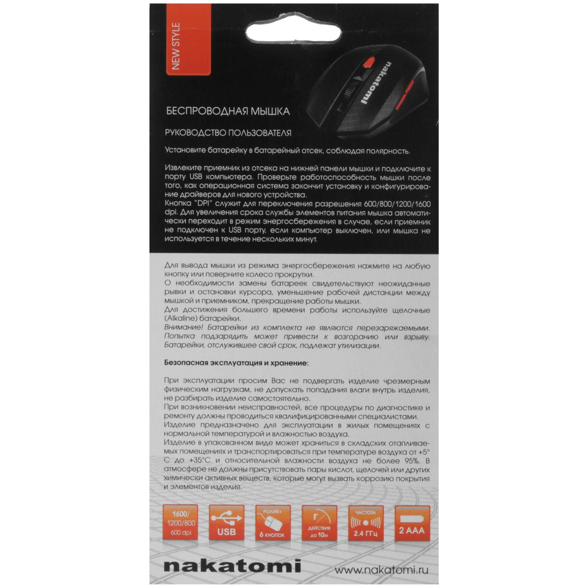 Мышь беспроводная Nakatomi MRON-08U черный, 1600 dpi, радиоканал, USB, кнопки - 6