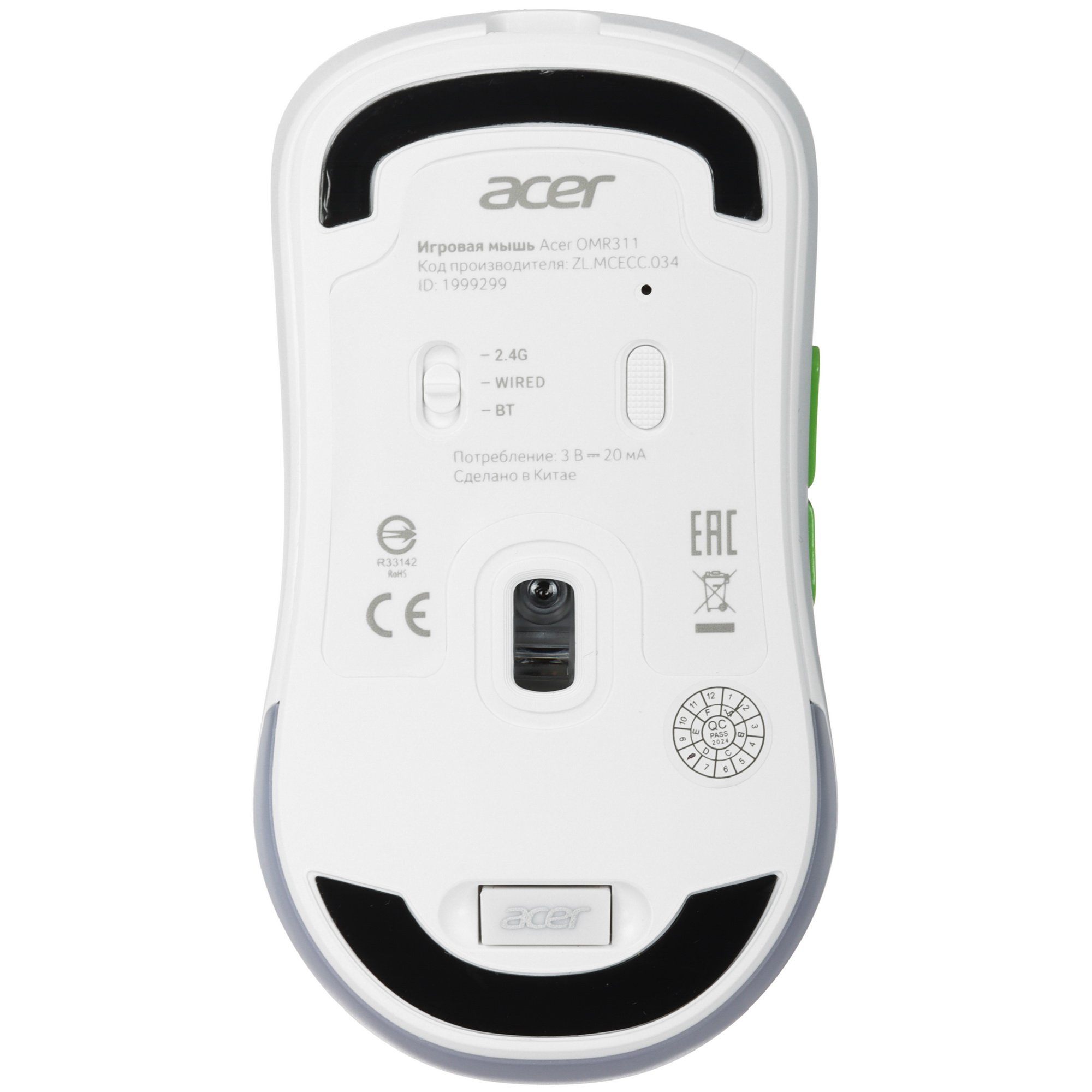 Мышь беспроводная Acer OMR311 белый, 2400 dpi, радиоканал, Bluetooth, USB, кнопки - 7