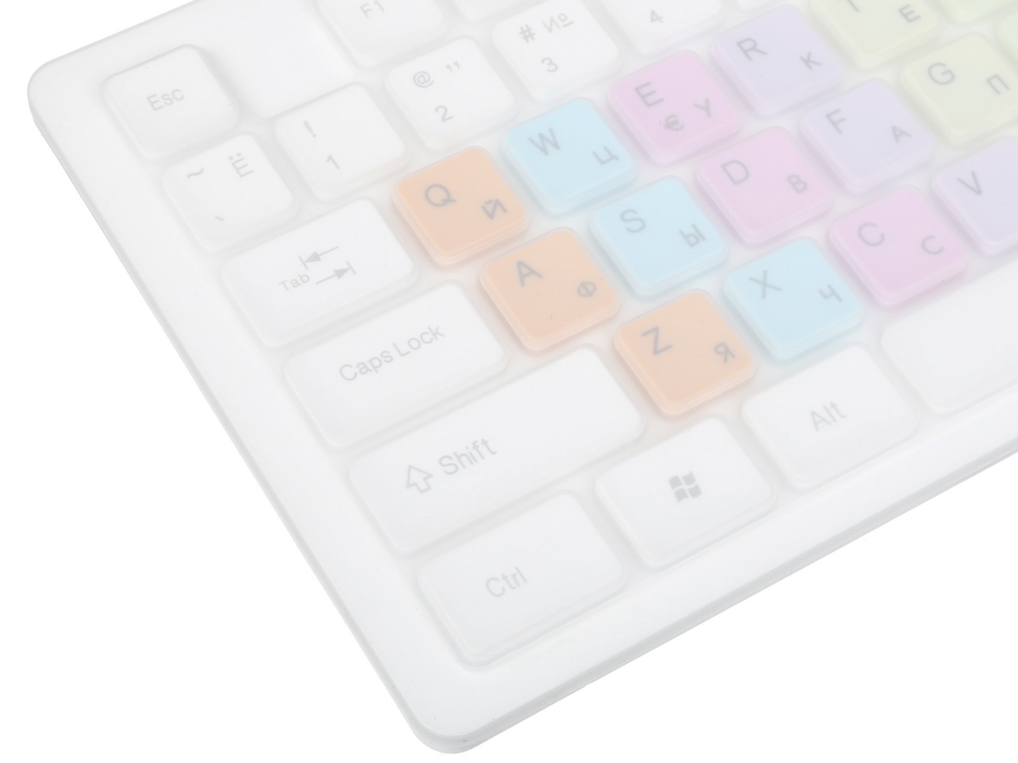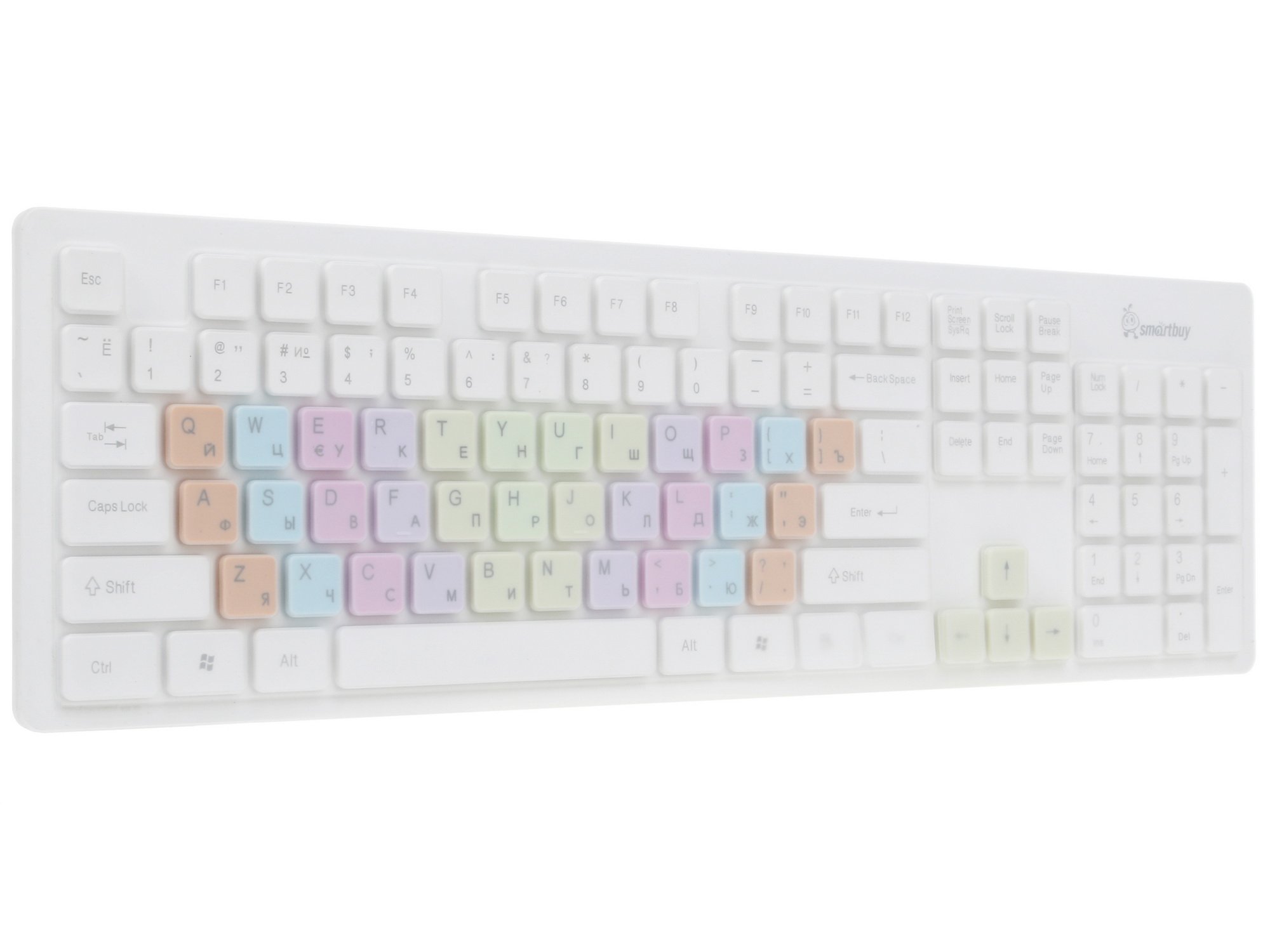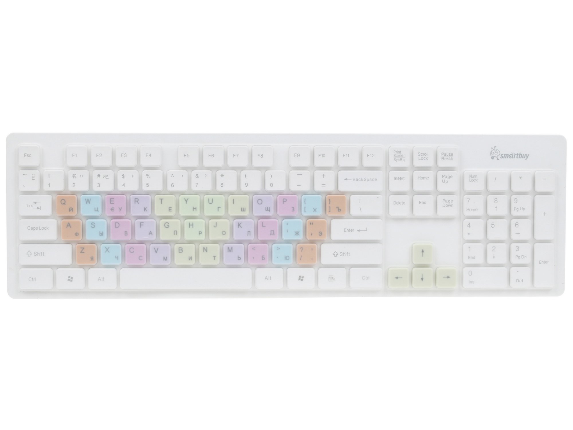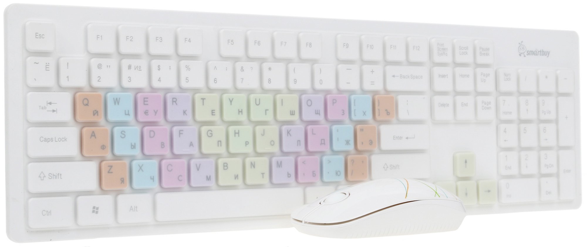 Клавиатура+мышь Smartbuy SBC-218346AG-W – это беспроводной комплект, дающий ощущение свободы и мобильности при работе с такими устройствами, ведь радиус их действия – 15 м. Основным цветом набора стал белый, но дополнительные цвета по-настоящему украсили этот комплект: клавиши выполнены в голубом, зеленом, оранжевом, фиолетовом и сиреневом цветах – такая расцветка поможет быстро найти необходимую клавишу. Всего клавиш – 104, они являются низкопрофильными, что обеспечивает им короткий и бесшумный ход.