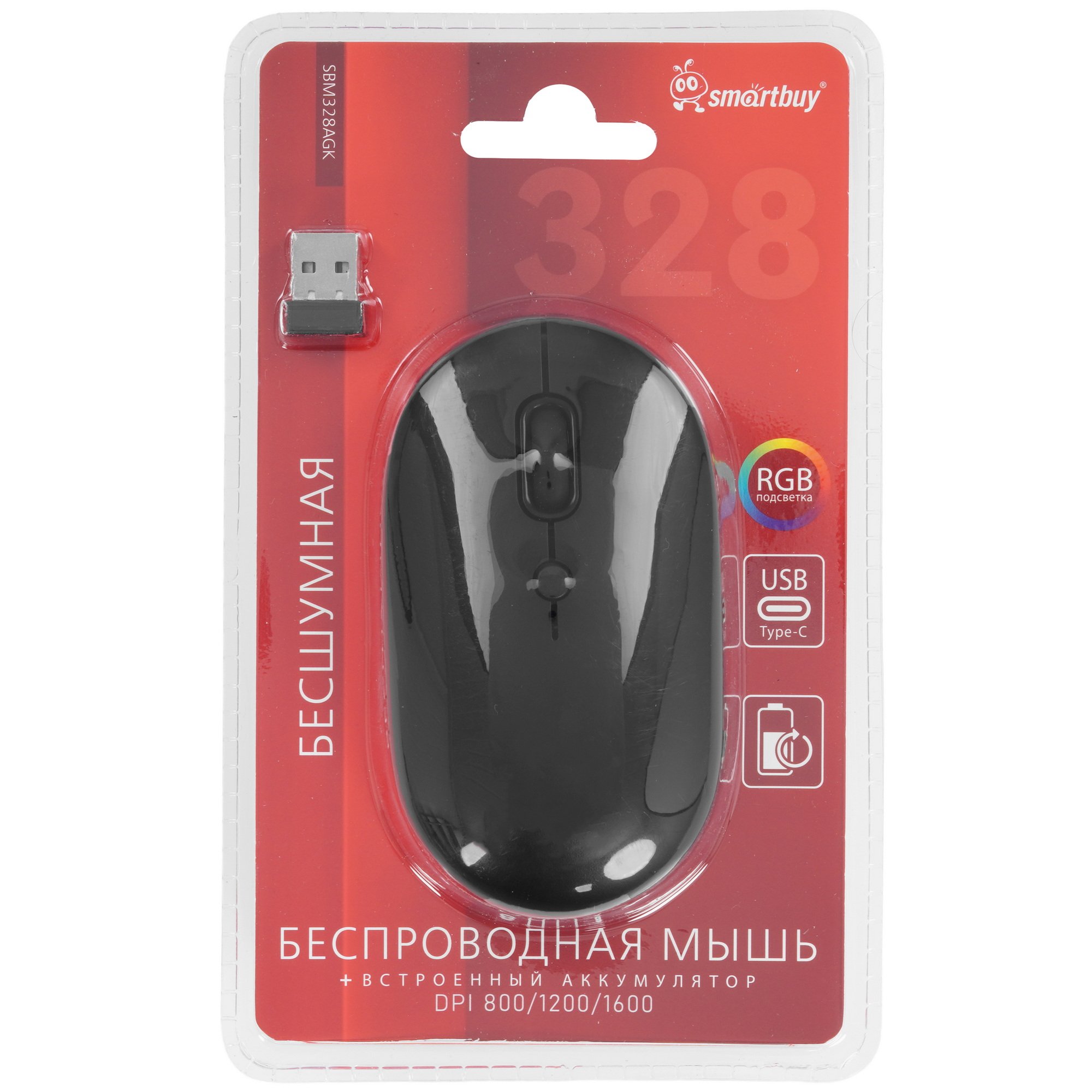 Мышь беспроводная Smartbuy 328AG [SBM328AGK] с корпусом черного цвета и интегрированной RGB-подсветкой выпускается как решение для домашнего или офисного системного блока. Полностью симметричный дизайн корпуса устройства ввода делает его комфортным для удержания как правой, так и левой рукой. В мышке имеются кнопка вкл/выкл питания, клавиша выключения/включения подсветки, прорезиненное колесико прокрутки и переключатель для выбора чувствительности сенсора. Разрешение датчика можно настроить в диапазоне 800-1600 dpi.