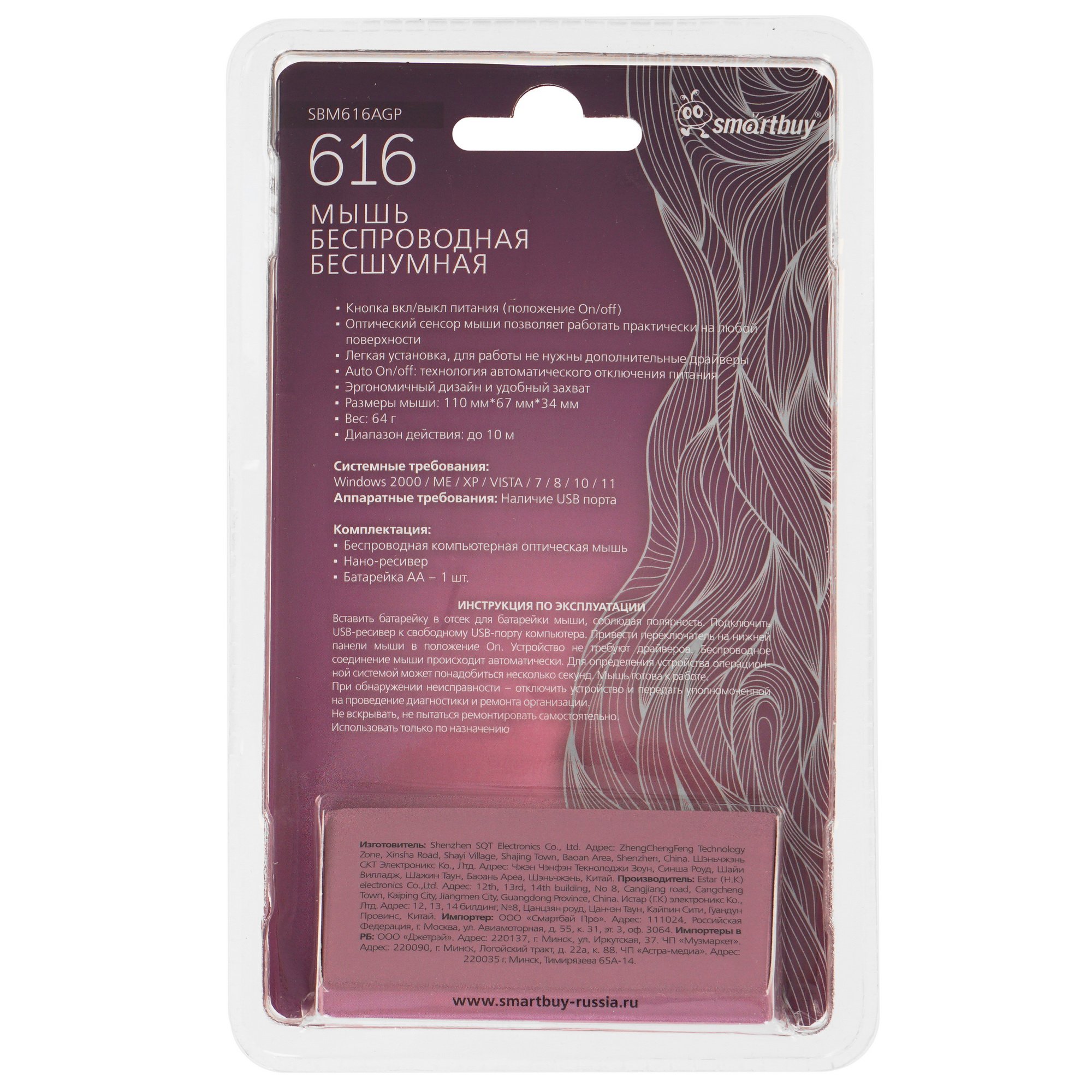 Мышь беспроводная Smartbuy 616AG – розовый манипулятор с компактными размерами и эргономичной формой корпуса, благодаря которой он комфортно ложится в руку. Модель обладает 6-кнопочной конструкцией для более удобной и быстрой работы с данными в различных офисных программах. В беспроводную мышь Smartbuy 616AG установлен оптический светодиодный сенсор с максимальным разрешением 1600 dpi, который поддерживает несколько режимов работы для выбора пользователем подходящего под решение определенных задач.